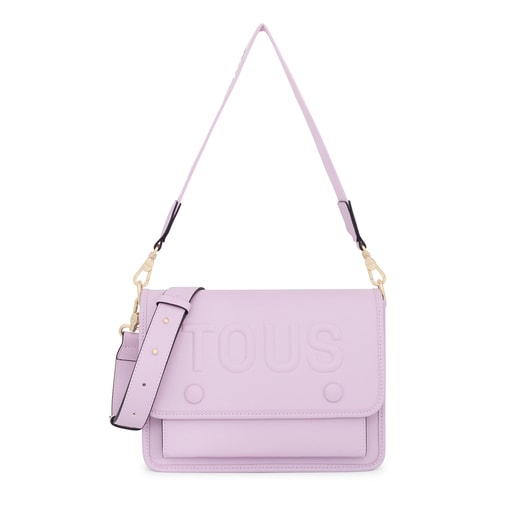 Medium TOUS La Rue Audree crossbody bag in synthetic leather with mauve cowhide leather trim. Flap closure with two magnetic buttons. Handbag with one open pocket on the front and two compartments separated by a zipped pocket inside. Detachable shoulder strap and adjustable and detachable crossbody strap. Measurements (height x width x depth): 19 x 26 x 12 cm.