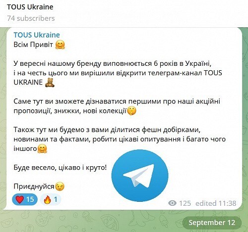 С помощью телеграмма наши клиенты не только смогут первыми узнавать о акциях и скидках, но и лучше узнают сам бренд TOUS.