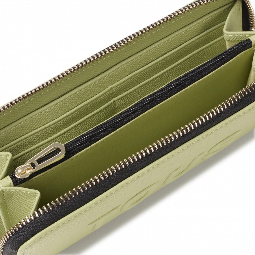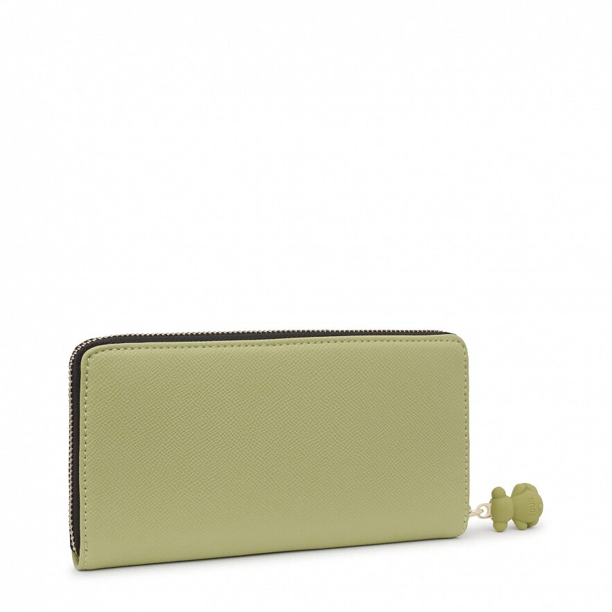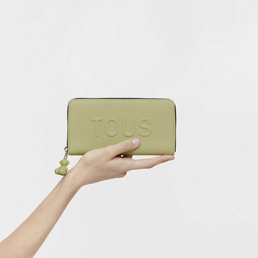 Кошелек TOUS La Rue New из искусственной кожи зеленого цвета. Закрывается на молнию. Внутри два открытых отделения для банкнот, отделение на молнии для монет и восемь слотов для карточек. Размеры (высота х ширина х глубина): 11 х 19,5 х 3 см.