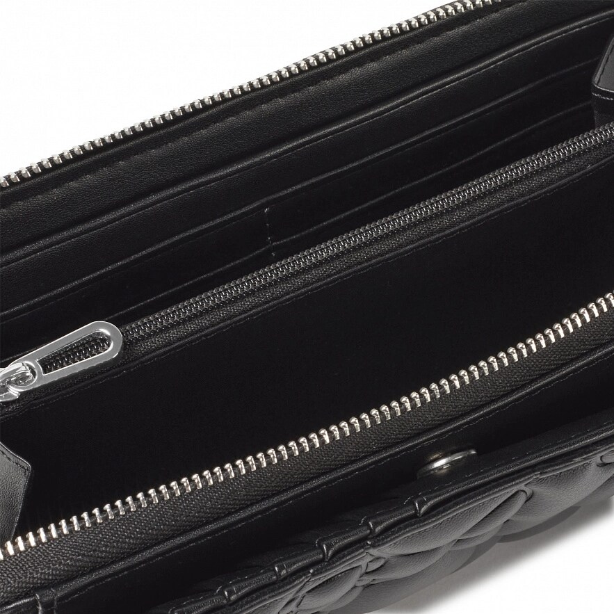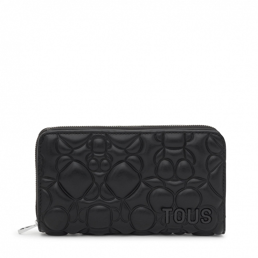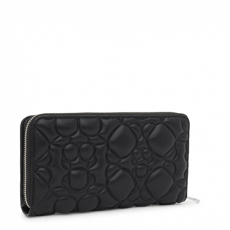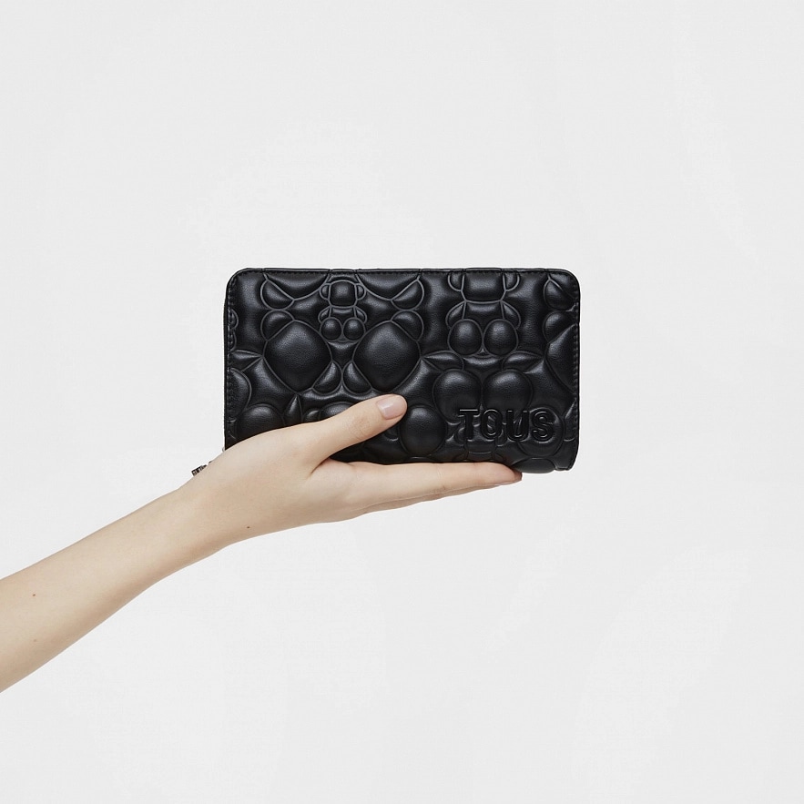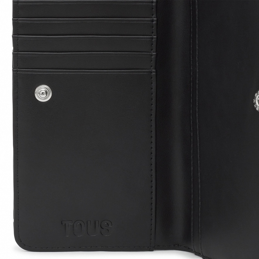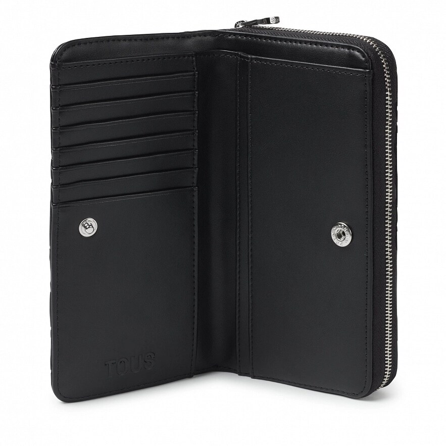 Кошелек TOUS Bold из искусственной кожи черного цвета. Имеет два основных отделения. Одно из них застегивается на кнопку и содержит отделение для купюр, три открытых отделения и семь слотов для карточек. Другое отделение закрывается на молнию и содержит два отделения для банкнот, двенадцать слотов для карточек и одно отделение для монет на молнии. Размеры (высота х ширина х глубина): 11 x 19 x 3,5 см.