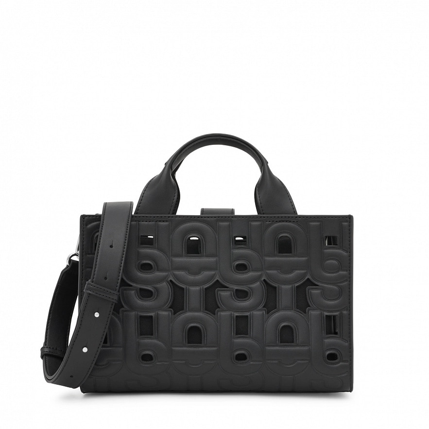 Сумка среднего размера TOUS Manifesto Cut Amaya из искусственной кожи черного цвета. Застежка на магнитной кнопке. Фиксированные ручки, регулируемый и съемный наплечный ремень. В комплект входит косметичка для мелочей на молнии внутри. Размеры (высота х ширина х глубина): 18 x 27 x 14 см.