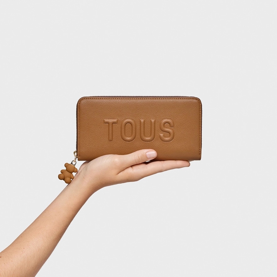 Кошелек TOUS Brenda из полиуретана цвета кемел. Закрывается на молнию. Внутри два открытых отделения для банкнот, отделение на молнии для монет и восемь слотов для карточек. Размеры (высота х ширина х глубина): 11 х 19,5 х 2,5 см.