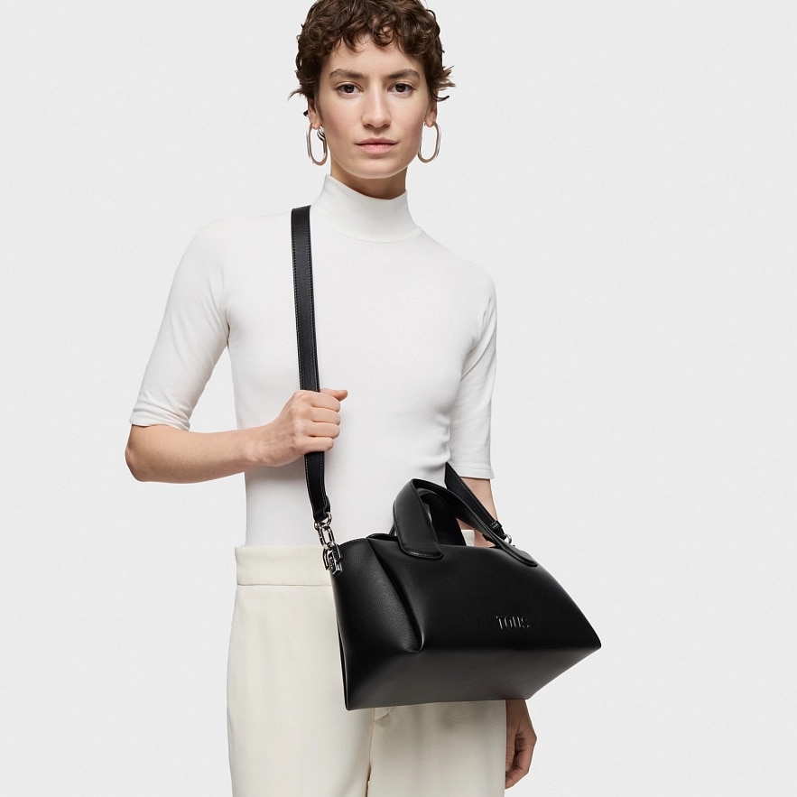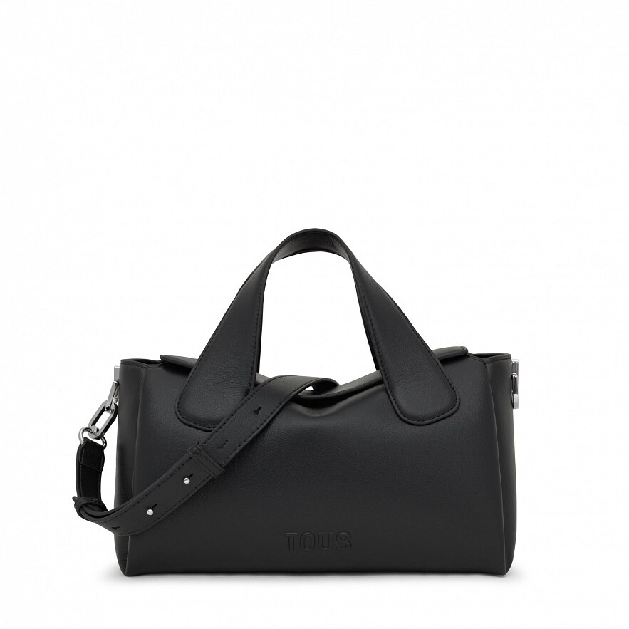 Сумка TOUS Bloom из полиуретана, средняя, черного цвета. Магнитная застежка. Фиксированные ручки и регулируемый, съемный наплечный ремень. Открытый внутренний карман открытый. Размеры (высота х ширина х глубина): 17 x 33 x 15 см.