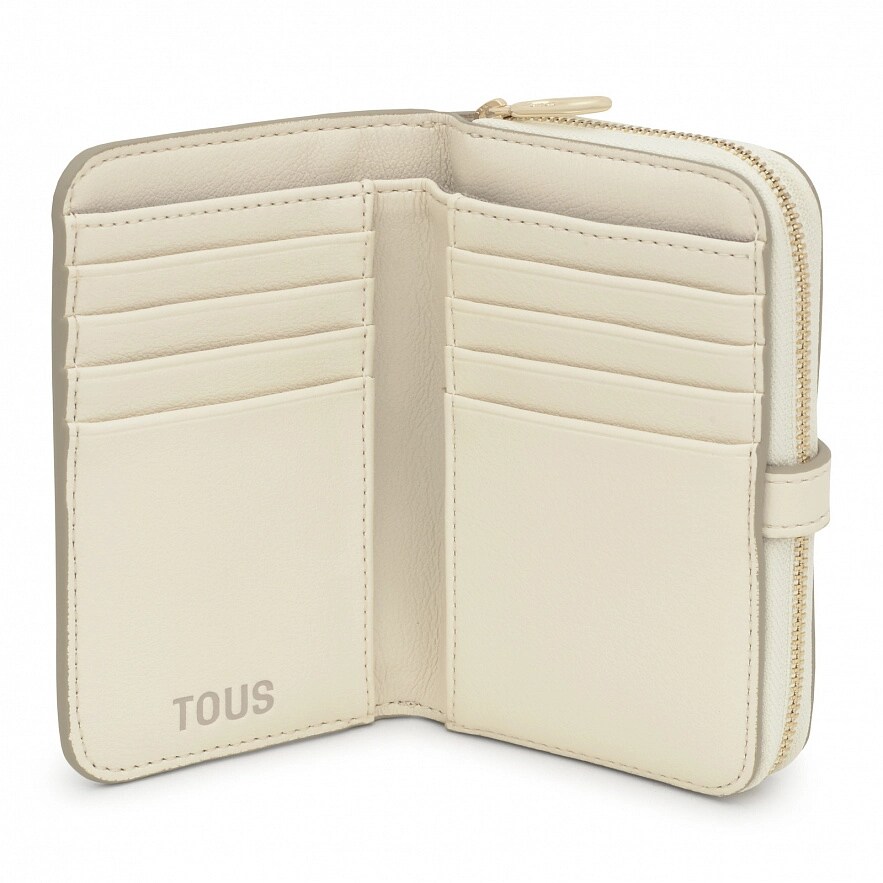 Кошелек TOUS Buckles Silhouette из искусственной кожи бежевого цвета, с полиуретановой отделкой. Закрывается на молнию. Внутри отделение для купюр, восемь слотов для карточек и два отделения для монет. Размеры (высота х ширина х глубина): 9,3 х 14,4 х 4,7 см.