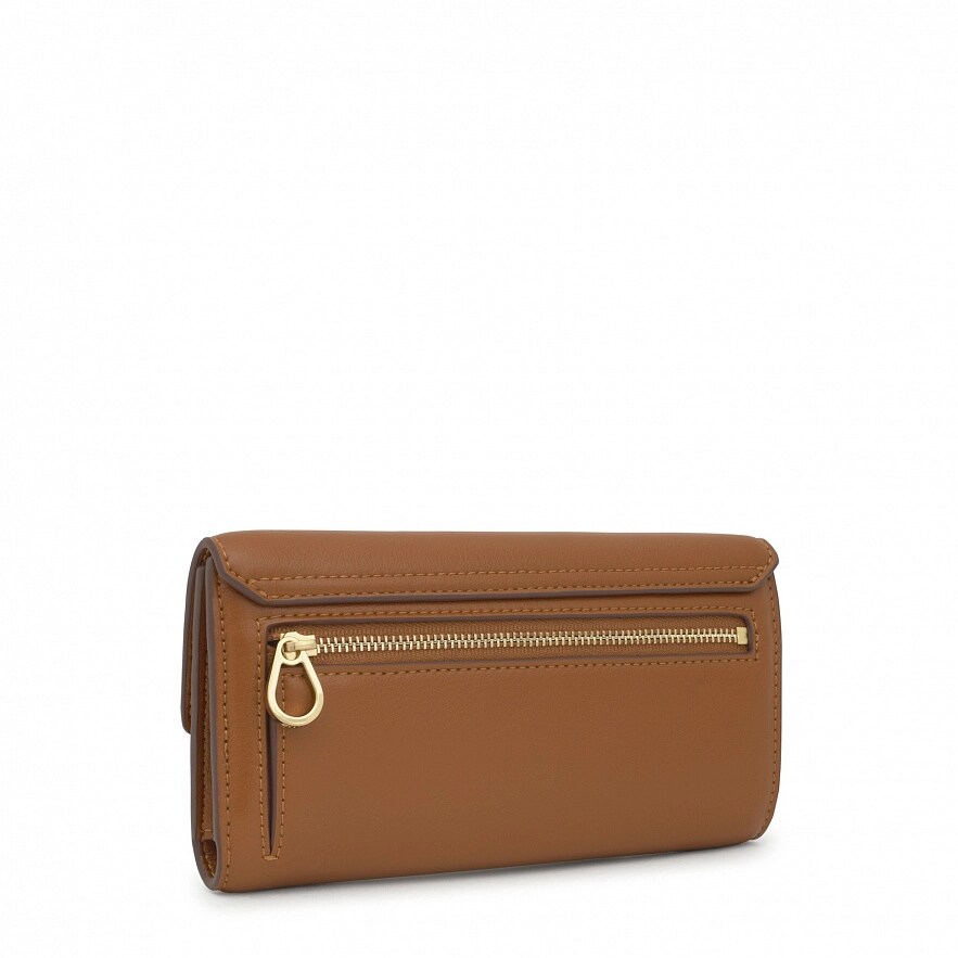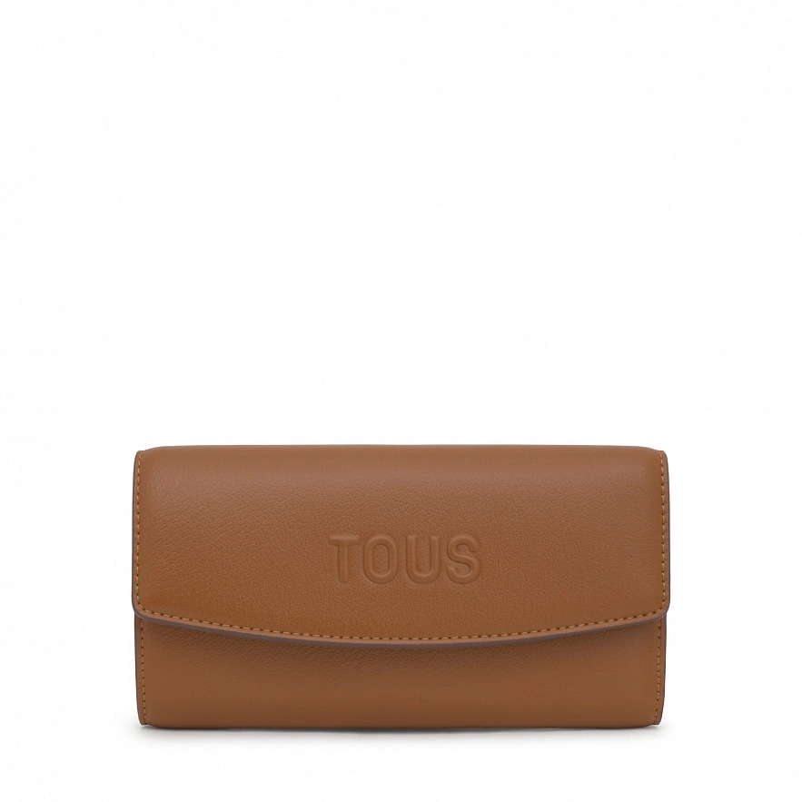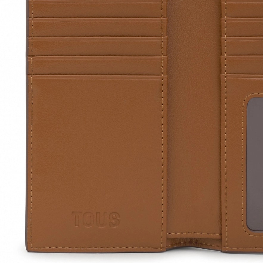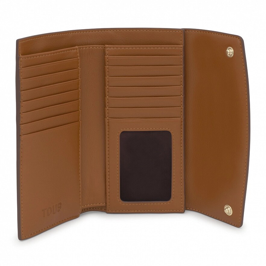 Кошелек TOUS Bloom из полиуретана, цвета кэмел. Закрывается клапаном на две кнопки. Внутри двенадцать слотов для карточек, один из которых прозрачный, и отделение для купюр. Внешний карман на молнии для монет. Размеры (высота х ширина х глубина): 10 х 18 х 2 см.