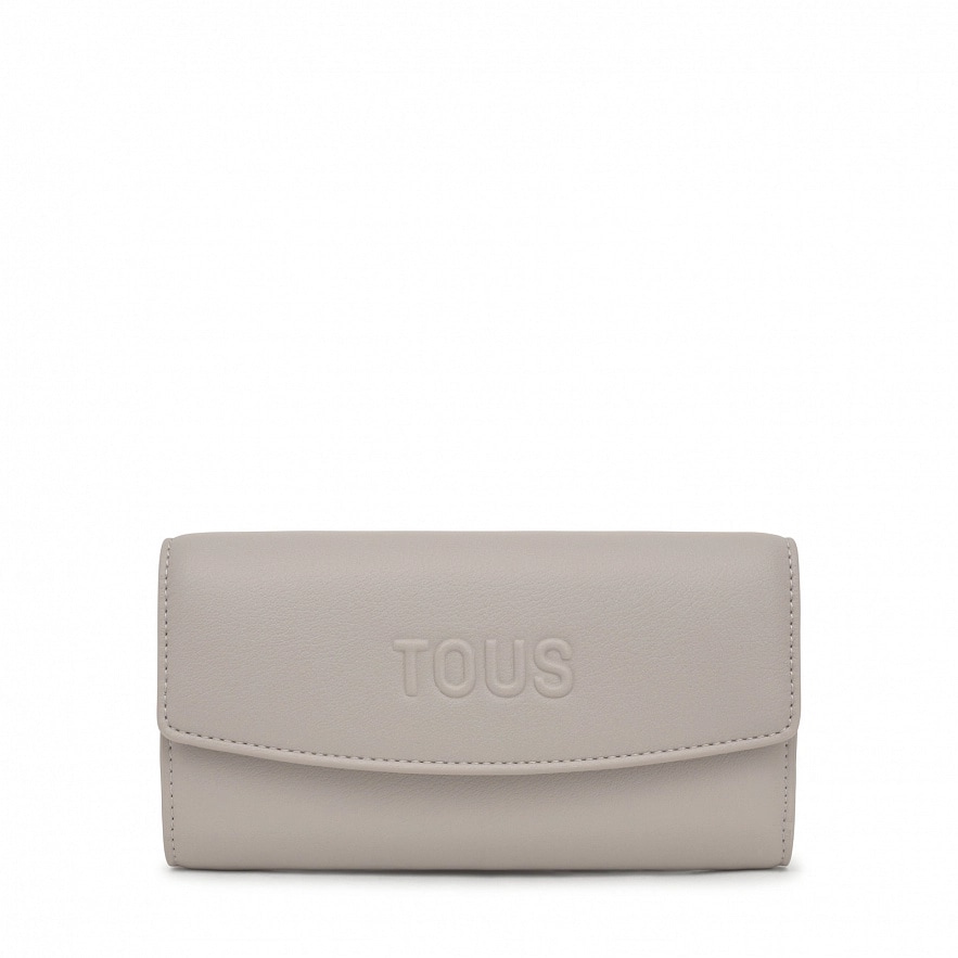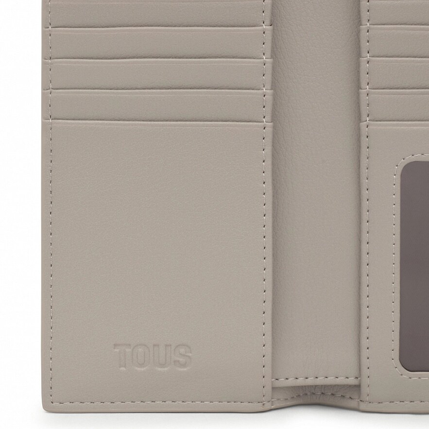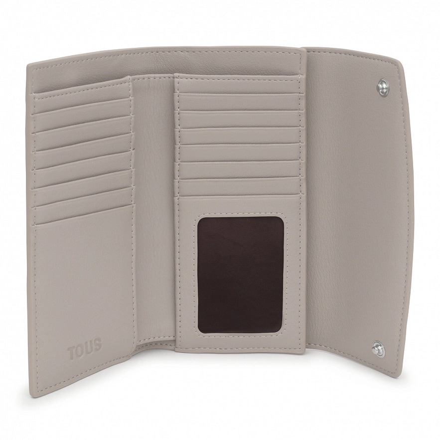 Кошелек TOUS Bloom из полиуретана, большой, серого цвета. Закрывается клапаном на две кнопки. Внутри двенадцать слотов для карточек, один из которых прозрачный, и отделение для купюр. Внешний карман на молнии для монет. Размеры (высота х ширина х глубина): 10 х 18 х 2 см.