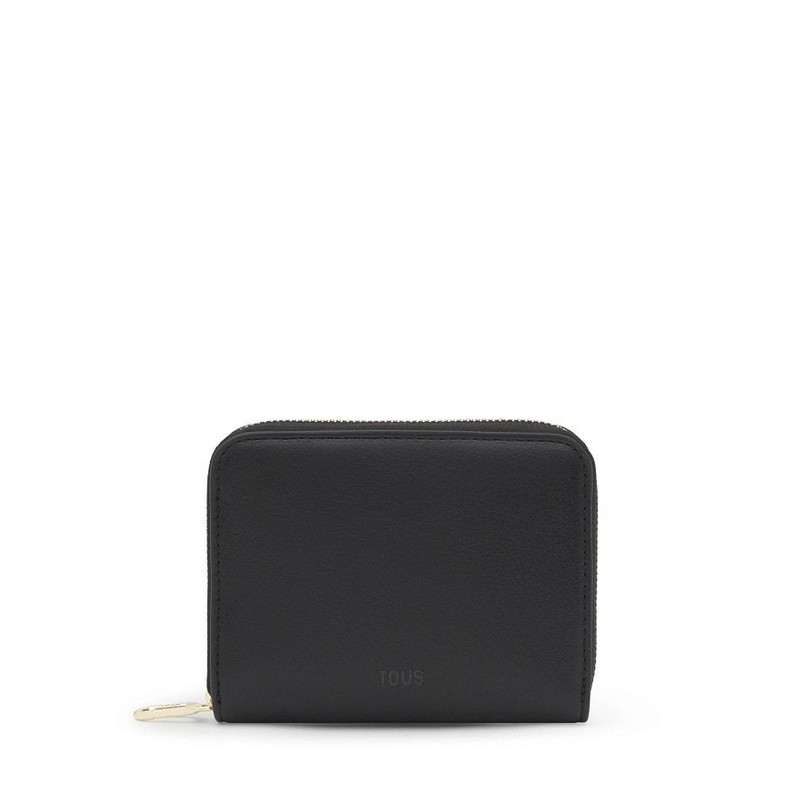 Кошелек TOUS City из черного полиуретана. Застежка-молния. Внутри есть шесть слотов для карт, отделение для банкнот и отделение на молнии для монет. Размеры (высота x ширина x глубина): 12,5 x 10 x 2 см.