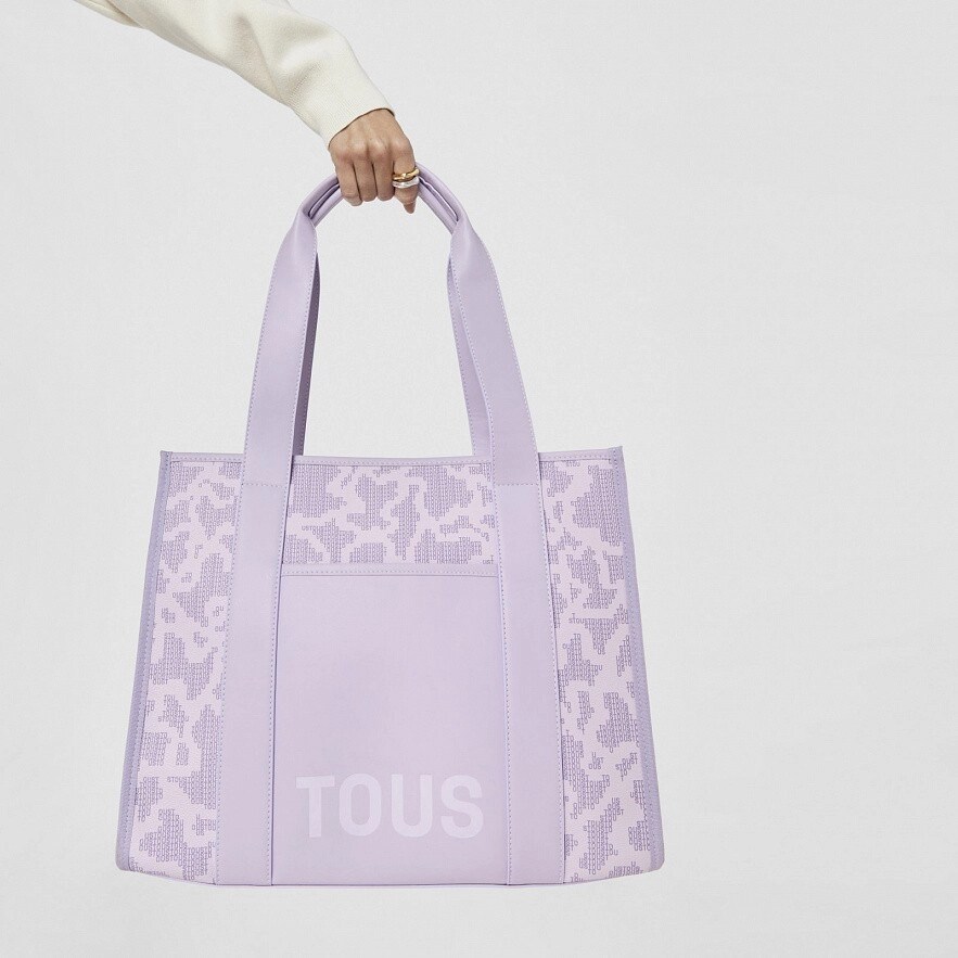 Сумка-шопер TOUS Kaos Pix Amaya, большого размера с принтом лилового цвета. Также имеет отделку из искусственной кожи. Застежка на магнитных кнопках. Открытый передний карман. Внутри есть карман на молнии, а также два открытых кармана и один держатель для ручек. Фиксированные плечевые лямки. Размеры (высота х ширина х глубина): 32 х 39 х 16 см.