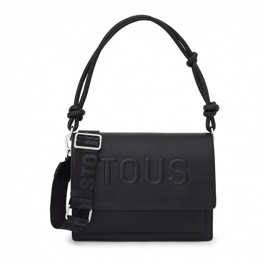 Сумка TOUS La Rue New Audree среднего размера через плечо из черной искусственной кожи. Имеет клапан и застежку на две магнитные кнопки. Два отделения, разделенных карманом на молнии и открытым карманом спереди. Фиксированный плечевой ремень и регулируемый съемный ремень через плечо. Размеры (высота x ширина x глубина): 18 x 25 x 12,5 см.