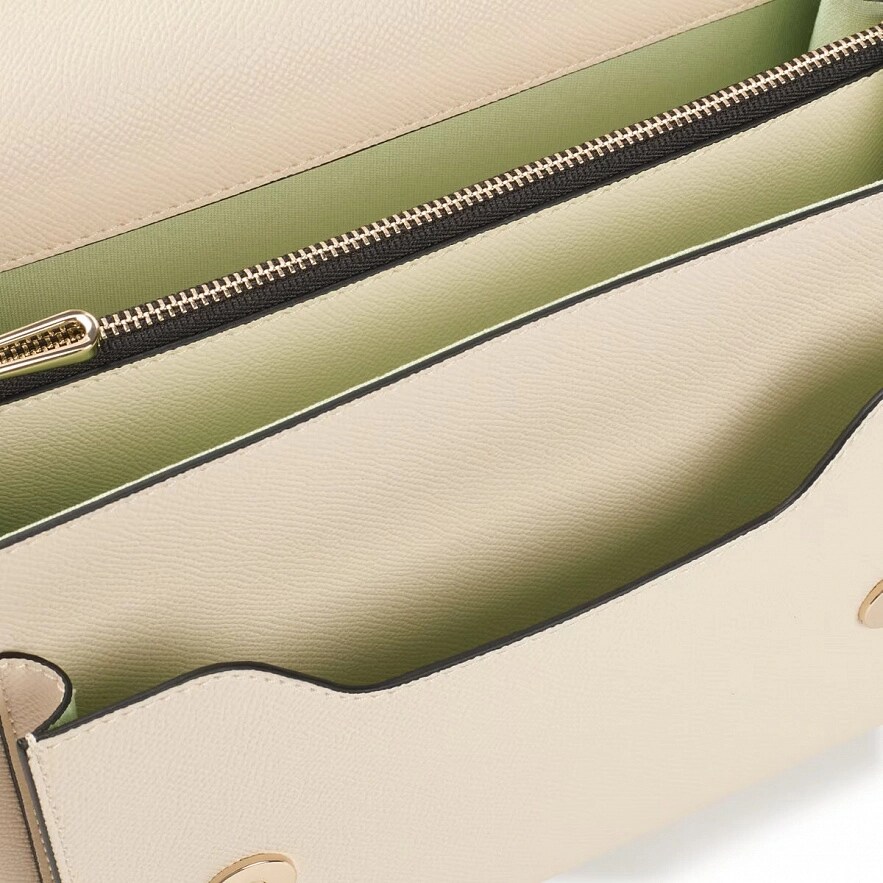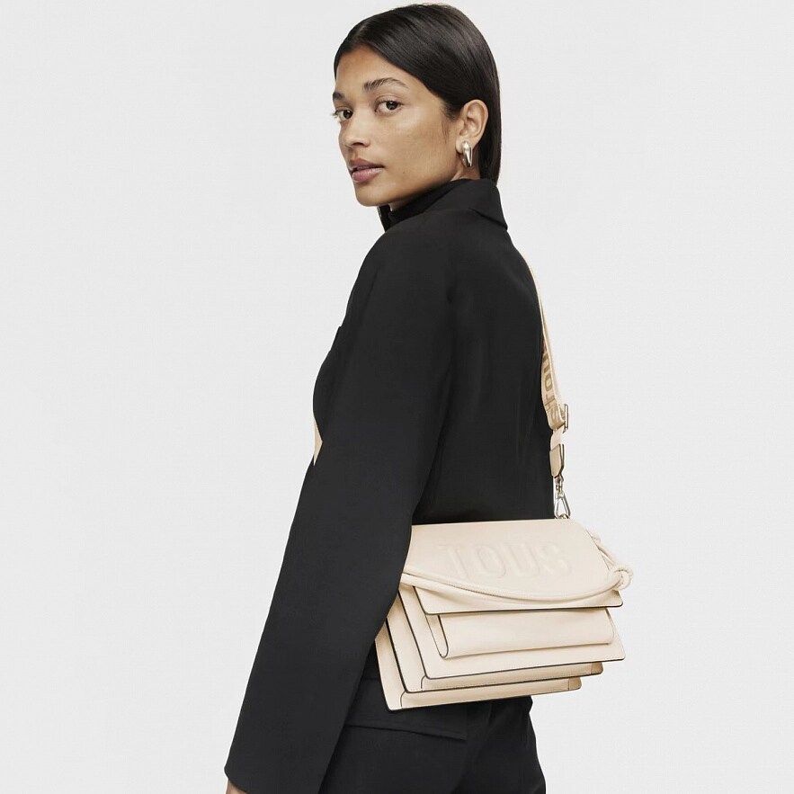 Сумка TOUS La Rue New из бежевой искусственной кожи. Имеет клапан и застежку на две магнитные кнопки. Имеет два отделения, разделенные одним на молнии, и открытый карман спереди. Фиксированный плечевой ремень и съемный регулируемый наплечный ремень. Размеры (высота х ширина х глубина): 18 х 25 х 12,5 см.
