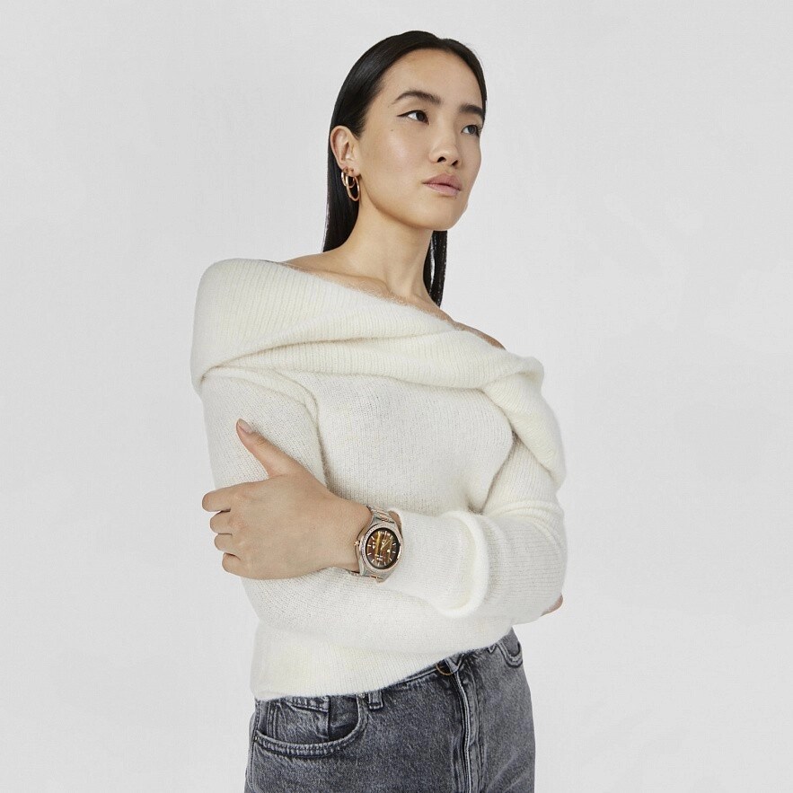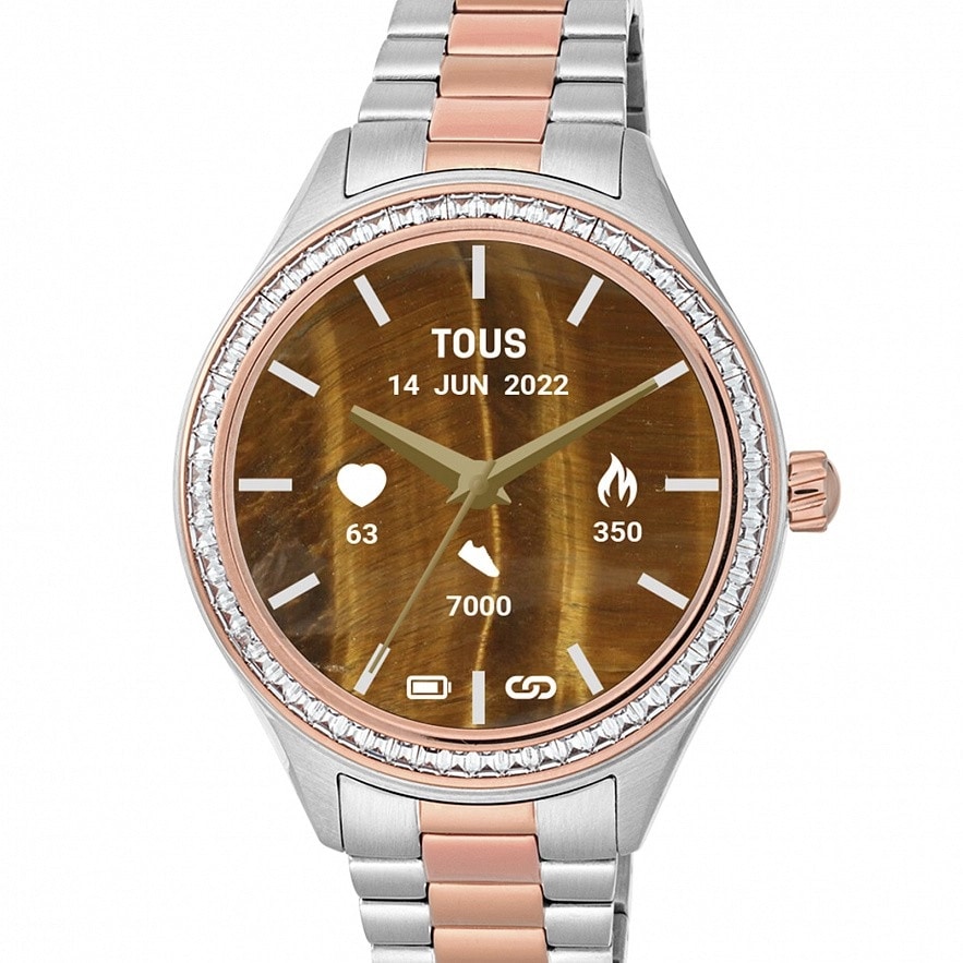 Безель с белыми фианитами. Совместимость: Android 7.0 и iOS 12.0 или выше. 1,09-дюймовый сенсорный экран (Full Touch). Операционная система: РТ ОС. Возможности подключения: Bluetooth версии BT 5.0. Оперативная память: SRAM M4, 128 Мб Flash ROM Батарея: 180 мАч, 3,7 В литиевая перезаряжаемая с магнитным кабелем, 5 дней работы и 10 дней в состоянии покоя. Чипсет/процессор: Realtek RTL8762C-VD — ARM Cortex-M0 — частота 53 МГц. Водонепроницаемый: IP68. Функции: 12 сфер TOUS и одна сфера могут быть взаимозаменяемы в приложении TOUS WEAR, часы, минуты, секунды, месяц, день, день недели, ежедневная активность со счетчиком шагов, счетчик калорий, пройденное расстояние в милях или километрах, спорт ( ходьба, бег, скалолазание, езда на велосипеде, беговая дорожка, эллиптический тренажер, гребной тренажер, хайит, йога, фитнес, теннис и скакалка), Вибробудильник, пульс, мониторинг сна, погода, хронограф 1/100 секунды, 3 игры и уведомления (звонки, WhatsApp, электронная почта, SMS, Facebook и т. д.), управление музыкой.