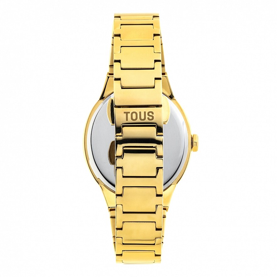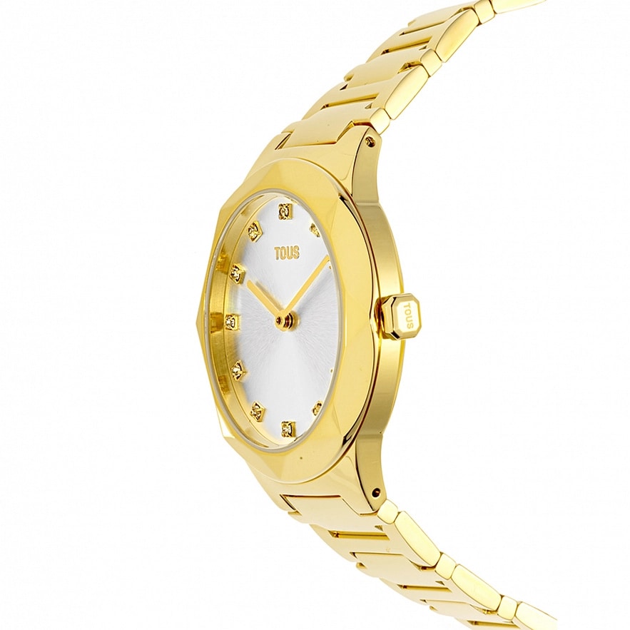 Часы TOUS Karat Oval с золотистым ремешком из стали IPG 316L, размером 33 x 39 мм и металлическим циферблатом с гранеными кристаллами на цифрах. Функции: часы и минуты. Водонепроницаемость до 5 АТМ. Батарейка: 1,55 В, оксид серебра SR621SW / 0,30 г. Японский кварцевый механизм. Раскладная застежка с кнопками.