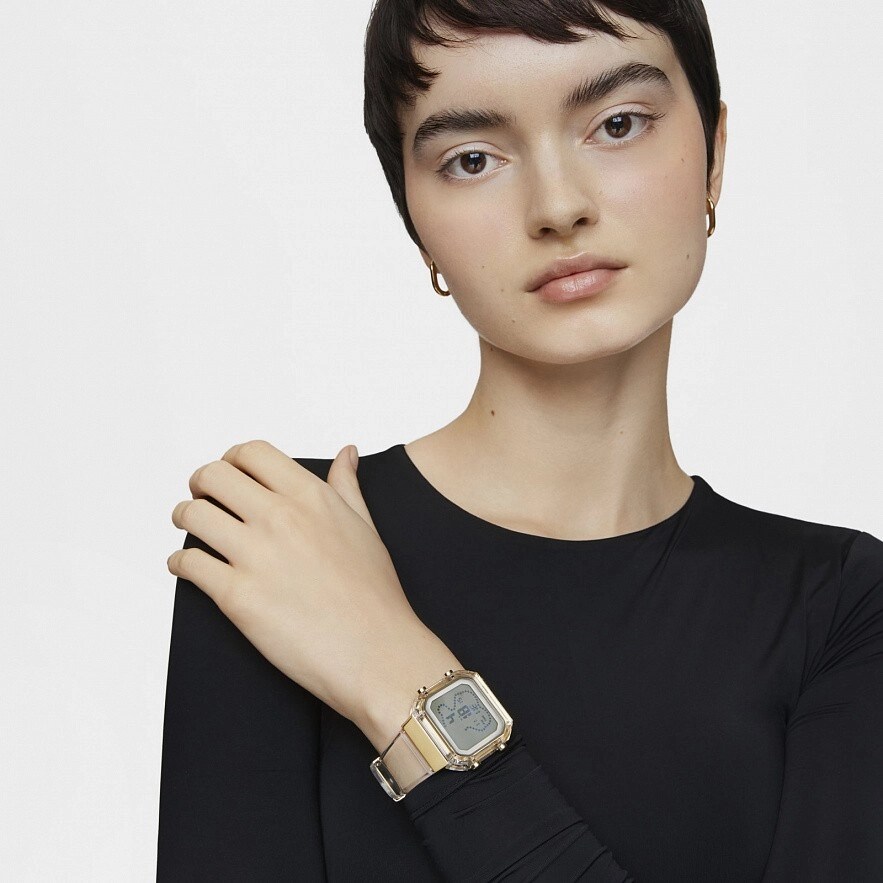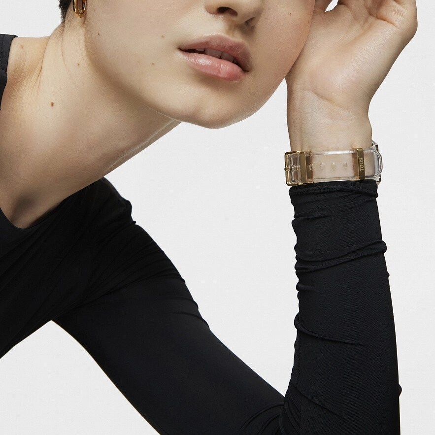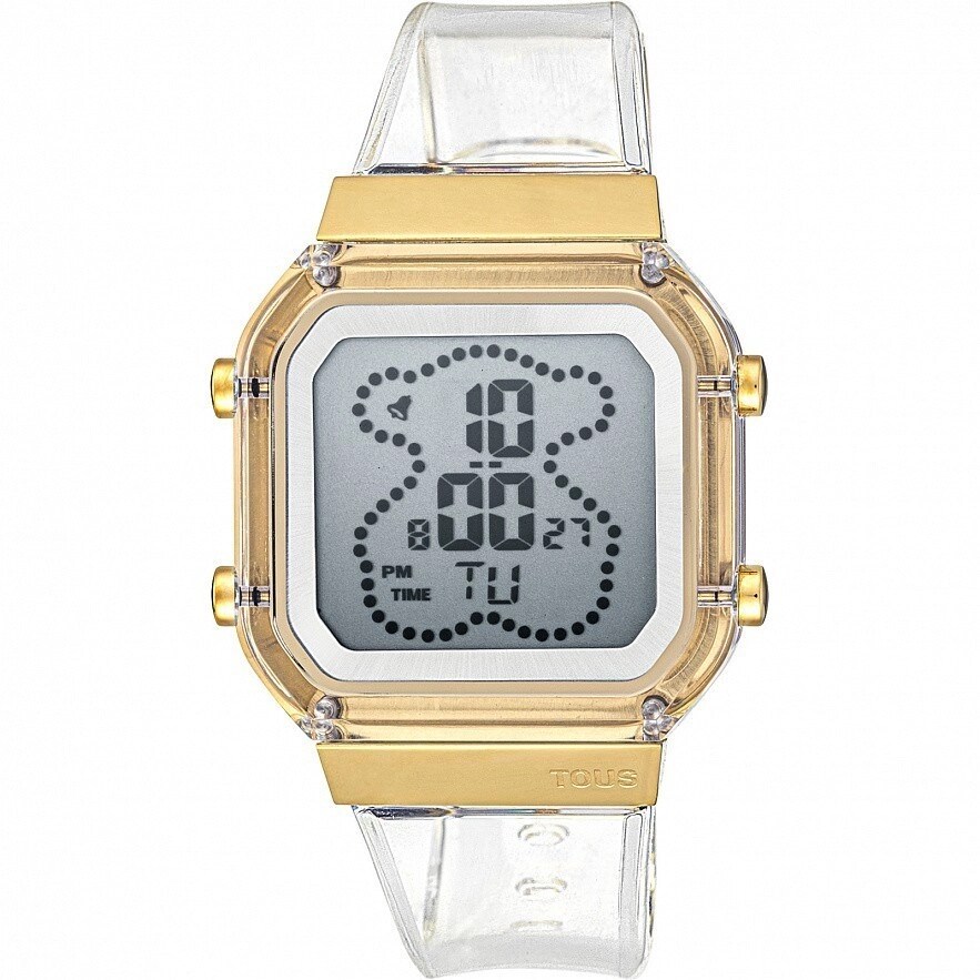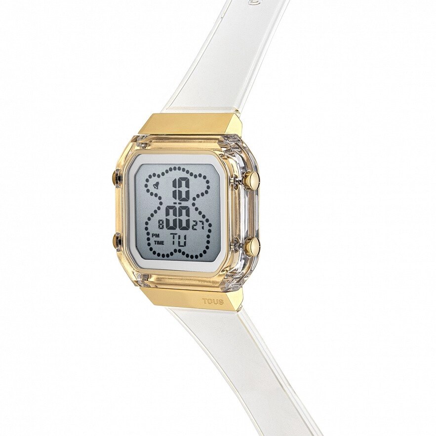 Цифровые часы TOUS D-BEAR с корпусом и ремешком из прозрачного поликарбоната в сочетании с деталями из стали IPG золотого цвета. Циферблат: металл/жидкокристаллический экран (LCD) с подсветкой. Диаметр корпуса: 36,5мм х 46,2мм. Функции: часы в 12 или 24-часовом формате, минуты, секунды, дата, месяц и день недели, часовой механизм, секундомер 1/100 секунды, таймер обратного отсчета и 5 будильников. Водонепроницаемый до 3 ATM. Батарейка: 3 В литиевая CR2025/2,5 г (литий 0,045 г). Калибр: CH1892. Кристалл: квадратный плоский. Обычная застежка со стальными петлями.