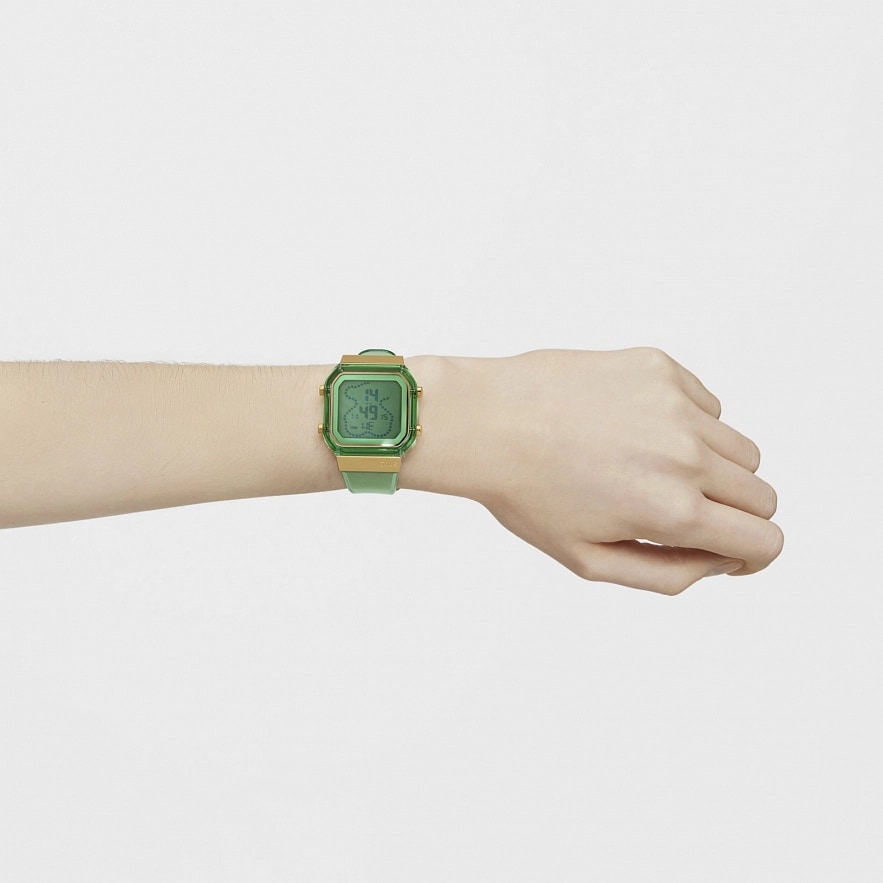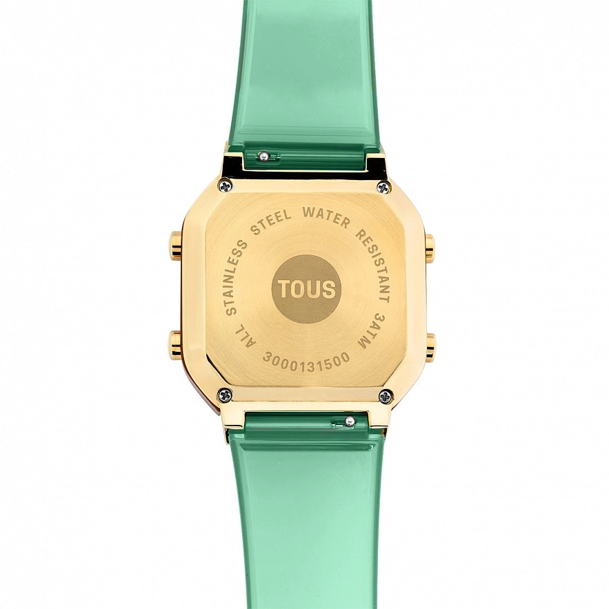 Цифровые часы D-BEAR с корпусом и ремешком из поликарбоната мятного цвета в сочетании с деталями из стали IPG золотистого цвета. Циферблат: металл/жидкокристаллический экран (LCD) с подсветкой. Диаметр корпуса: 36,5 мм х 46,2 мм. Функции: часы в 12 или 24-часовом формате, минуты, секунды, дата, месяц и день недели, часовой механизм, секундомер 1/100 секунды, таймер обратного отсчета и 5 будильников. Водонепроницаемые до 3 ATM. Батарейка: 3 В литиевая CR2025 / 2,5 грамма (литий 0,045 грамма). Калибр: CH1892. Кристалл: квадратный плоский. Застежка со стальными петлями.