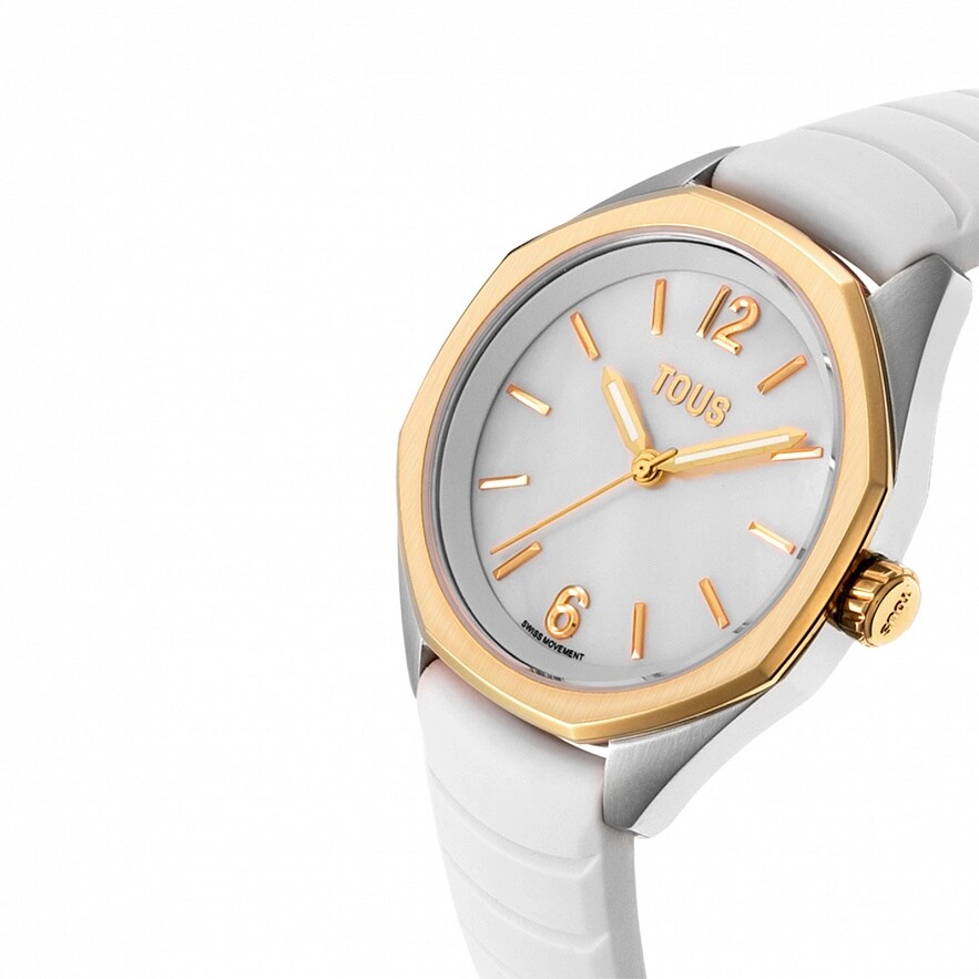 Часы TOUS Now Lady с белым каучуковым ремешком. Диаметр: 34,5 мм. Циферблат: перламутровый. Механизм: аналоговый швейцарский кварц. Стекло: круглое, плоское сапфировое с антибликовым покрытием. Камни по краям: 5 синтетических рубинов. Функции: часы, минуты и секунды. Водонепроницаемость до 10 АТМ. Браслет: 16 мм х 16 мм х 70 мм / 16 мм х 16 мм х 110 мм.