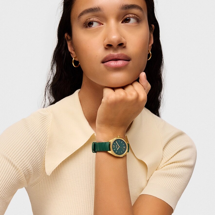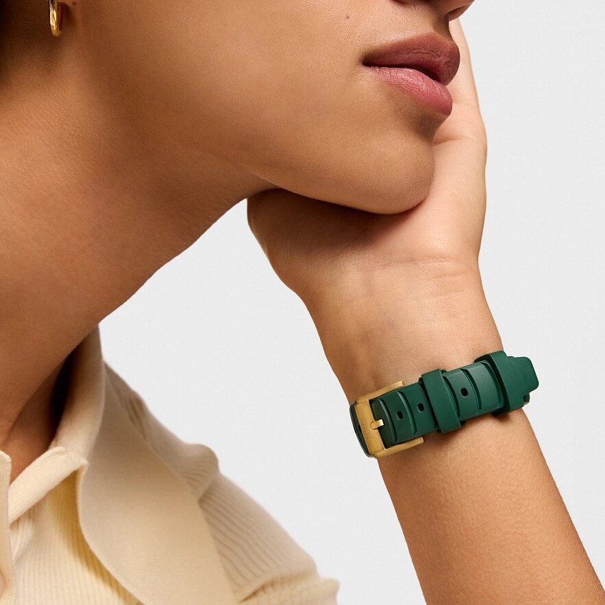 Часы TOUS Now с зеленым каучуковым ремешком. Диаметр: 34,5 мм. Циферблат: зеленый перламутр. Механизм: аналоговый швейцарский кварц. Стекло: круглое, плоское сапфировое с антибликовым покрытием. Камни по краям: 5 синтетических рубинов. Функции: часы, минуты и секунды. Водонепроницаемость до 10 АТМ. Браслет: 16 мм х 16 мм х 70 мм / 16 мм х 16 мм х 110 мм.