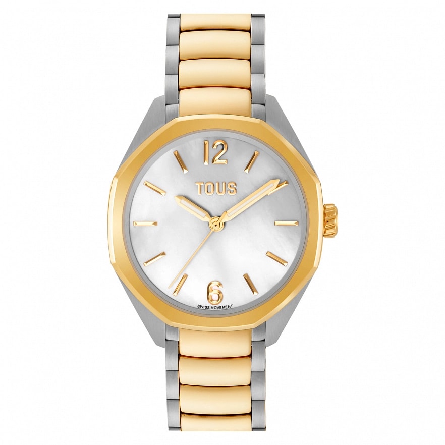 Часы TOUS Now с браслетом из нержавеющей стали и стальным корпусом золотистого цвета. Диаметр: 34,5 мм. Циферблат: перламутровый. Механизм: аналоговый швейцарский кварц. Стекло: круглое, плоское сапфировое с антибликовым покрытием. Камни по краям: 5 синтетических рубинов. Функции: часы, минуты и секунды. Водонепроницаемость до 10 АТМ. Браслет: 16 мм х 16 мм х 82 мм. Застежка: бабочка с кнопками.