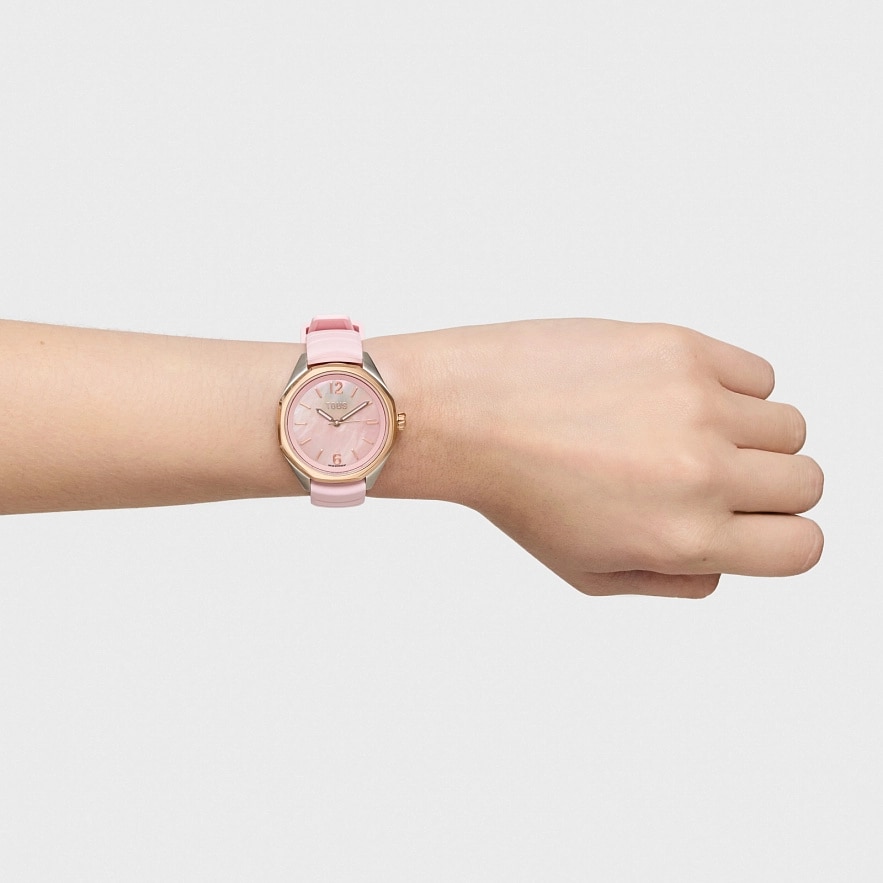 Часы TOUS Now с розовым каучуковым ремешком. Диаметр: 34,5 мм. Циферблат: перламутр розового цвета. Механизм: аналоговый швейцарский кварц. Стекло: круглое, плоское сапфировое с антибликовым покрытием. Камни по краям: 5 синтетических рубинов. Функции: часы, минуты, секунды. Водонепроницаемость до 10 АТМ. Браслет: 16 мм х 16 мм х 70 мм / 16 мм х 16 мм х 110 мм.