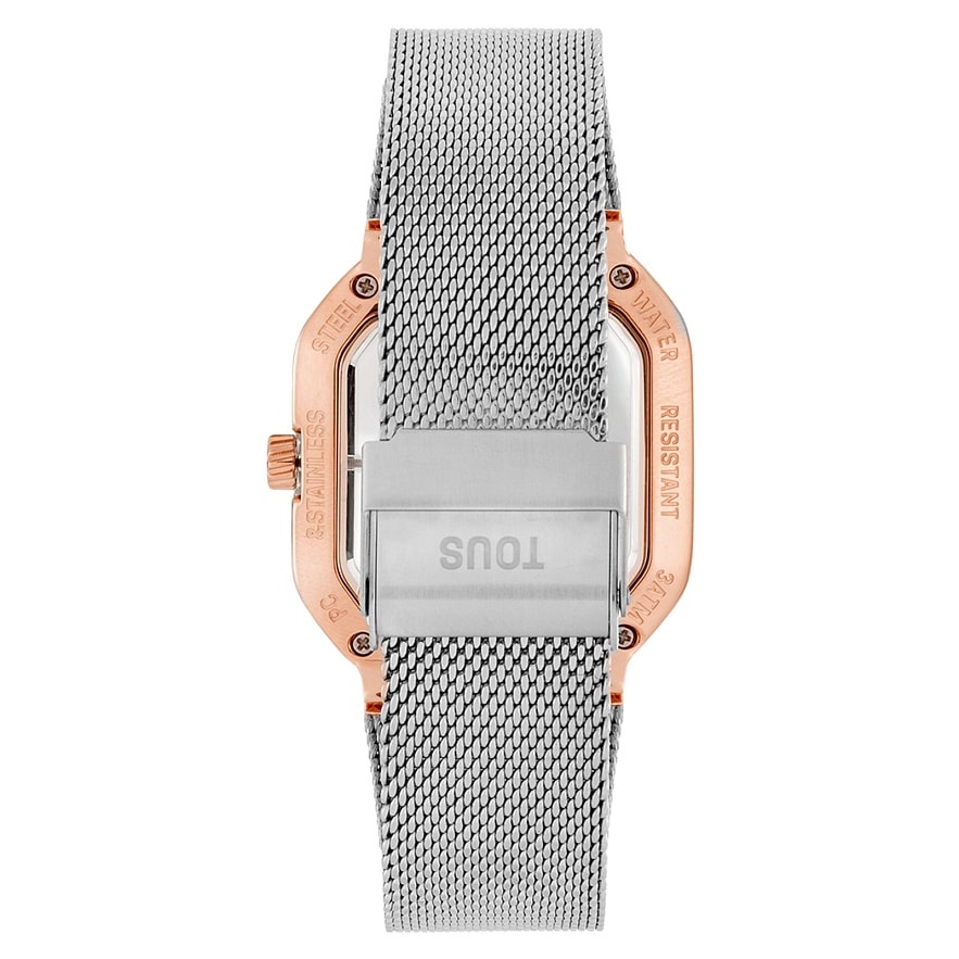 Часы TOUS D-Bear Party с браслетом из нержавеющей стали, розового цвета и прозрачным корпусом. Размеры: 36 мм х 48 мм. Металлический циферблат с акриловым граненым медвежонком в стиле драгоценных камней. Стекло: плоское, восьмиугольное минеральное стекло. Функции: часы и минуты. Водонепроницаемый до 3 АТМ. Движение: аналоговый японский кварц. Браслет: 23 мм х 18 мм х 74 мм / 23 мм х 18 мм х 105 мм. Миланская сетка с защитной застежкой.
