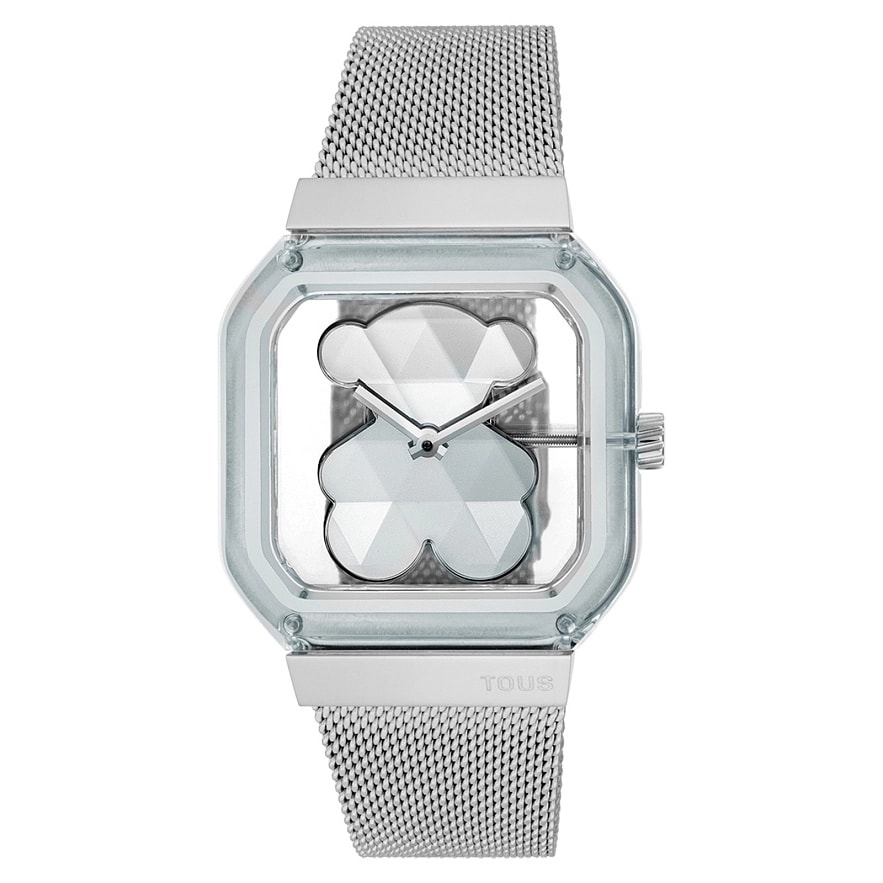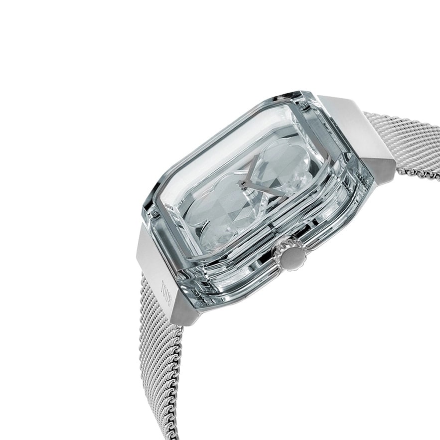 Часы TOUS D-Bear Party с браслетом из нержавеющей стали и прозрачным корпусом. Размеры: 36 мм х 48 мм. Металлический циферблат с акриловым граненым медвежонком в стиле драгоценных камней. Стекло: плоское, восьмиугольное минеральное стекло. Функции: часы и минуты. Водонепроницаемый до 3 АТМ. Движение: аналоговый японский кварц. Браслет: 23 мм х 18 мм х 74 мм / 23 мм х 18 мм х 105 мм. Миланская сетка с защитной застежкой.
