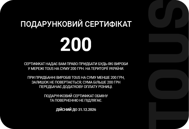 Заказывайте идеальный подарок - СЕРТИФИКАТ * TOUS. Сертификат дает возможность приобрести товары ТМ TOUS путем вычитания из розничной стоимости товара номинальной стоимости подарочного сертификата. Подарочный сертификат действует во всех магазинах TOUS на территории Украины и не подлежит возврату. Конечная дата действия сертификата указана на обратной стороне. *Сертификат - это физическое пластиковая карта с указанным номиналом.