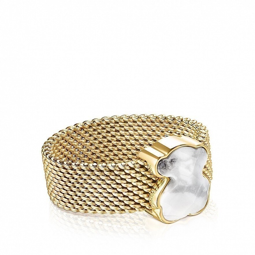 Кольцо TOUS Mesh Color из стали с золотистым ионным напылением, с медвежонком из хаулита и каемкой из вермеля. Размер медвежонка: 1,1 см. Ширина кольца: 8 мм. Серебро высшей пробы, покрытое золотом 18 карат минимальной толщины от 3 до 5 микрон, без каких-либо промежуточных слоев.