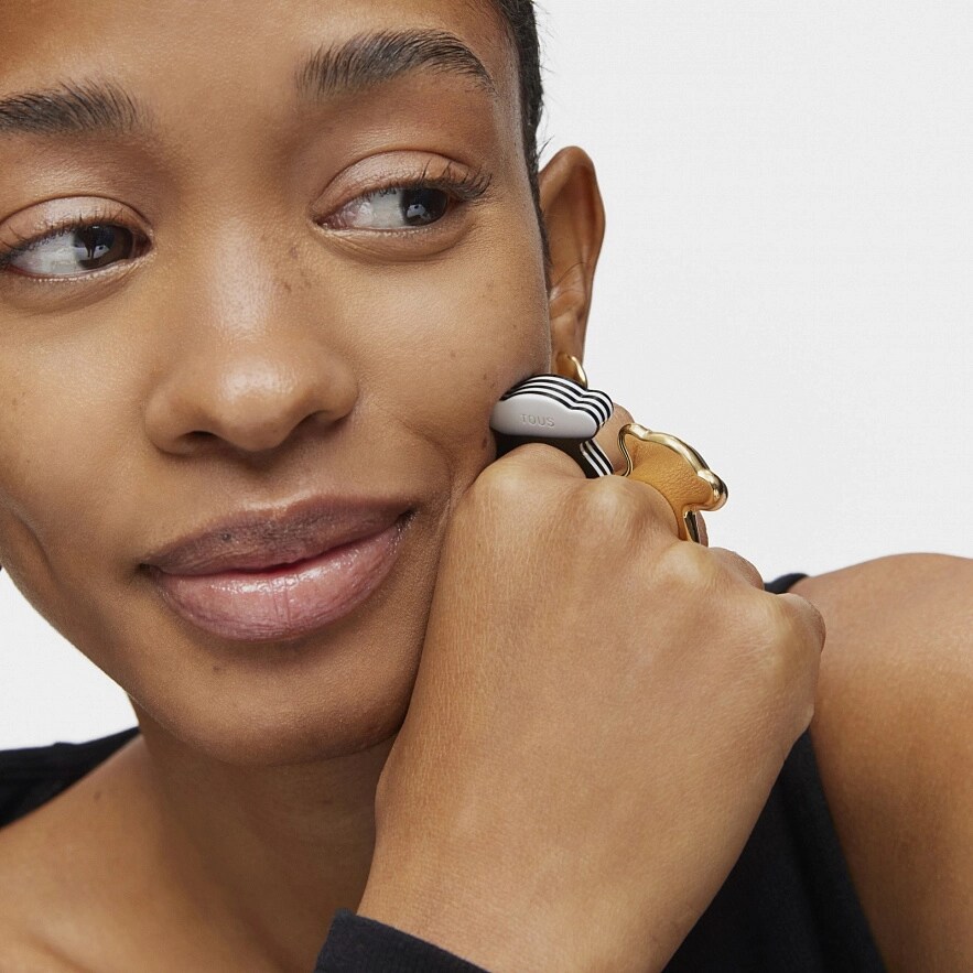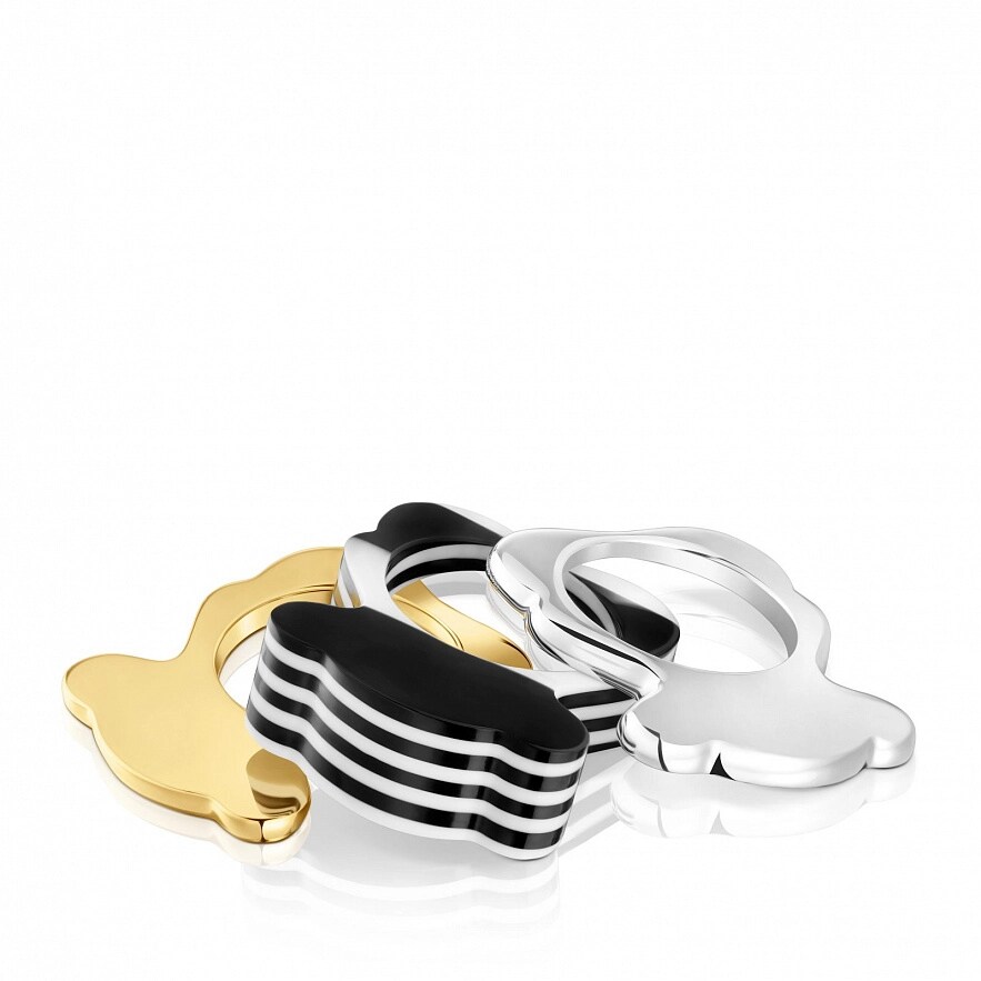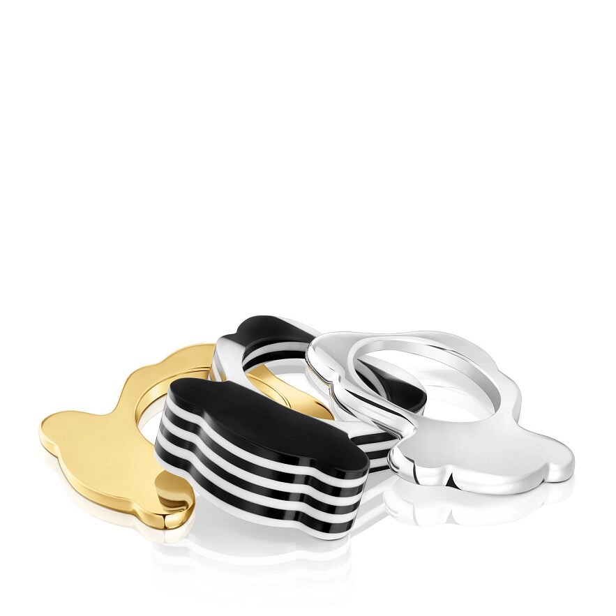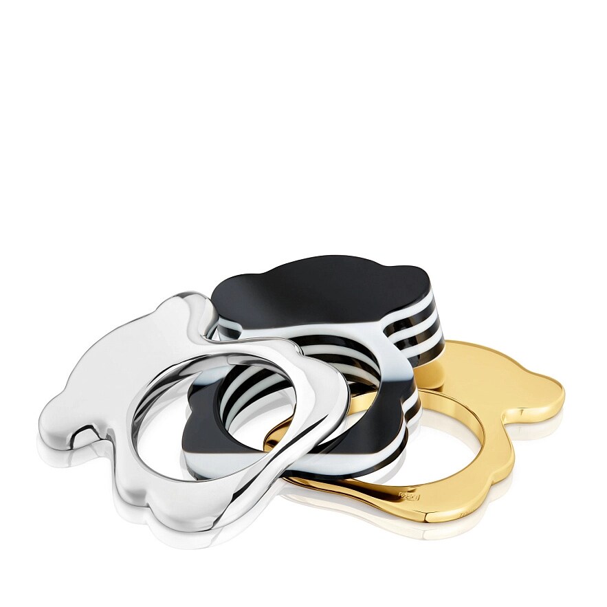 Набор из трех колец TOUS My Other Half с мишеками: одно из серебра 925 пробы, второе из серебра 925 пробы с покрытием Vermeil , и третье из разноцветного черного ацетата. Высота колец: 11 мм. Ширина колец: 3 мм. Толщина: 1,9 мм и 4 мм. Примечание: эти кольца можно комбинировать с другими кольцами из коллекции и добавлять друг к другу, а также использовать как кулоны.