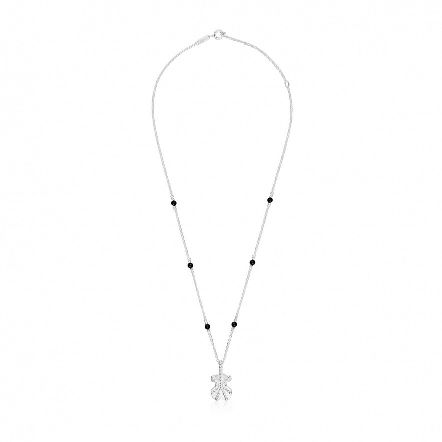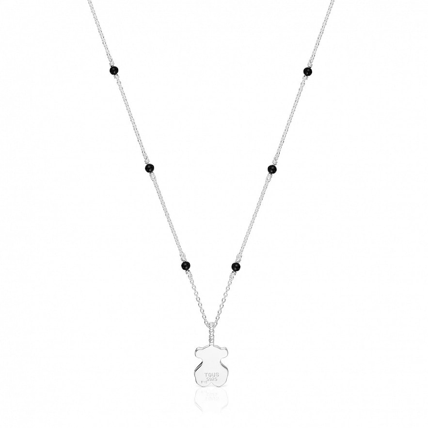 Ожерелье TOUS Grain из серебра 925 пробы, переплетенные шармы из круглого ограненного оникса и подвеска с мишкой. Размер мишки: 15 мм. Размер драгоценных камней: 3,5-4 мм. Длина ожерелья: 40-45 см. Застежка - пружинное кольцо.