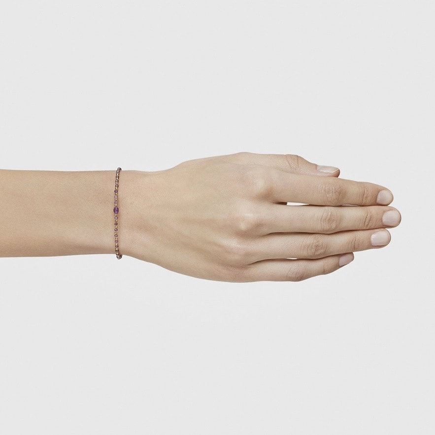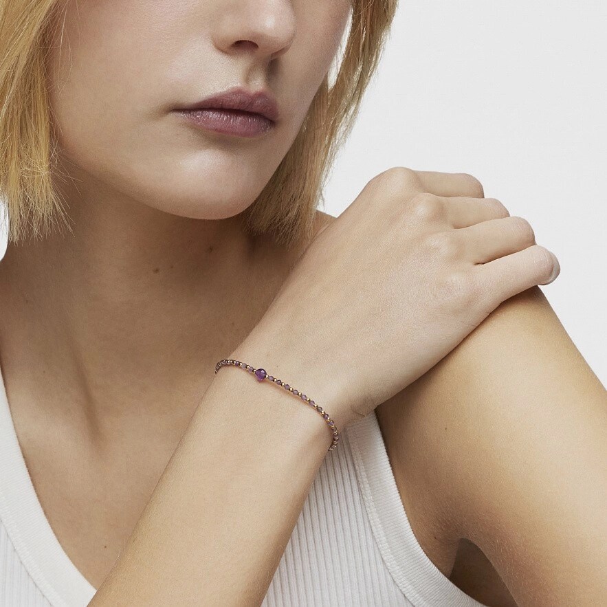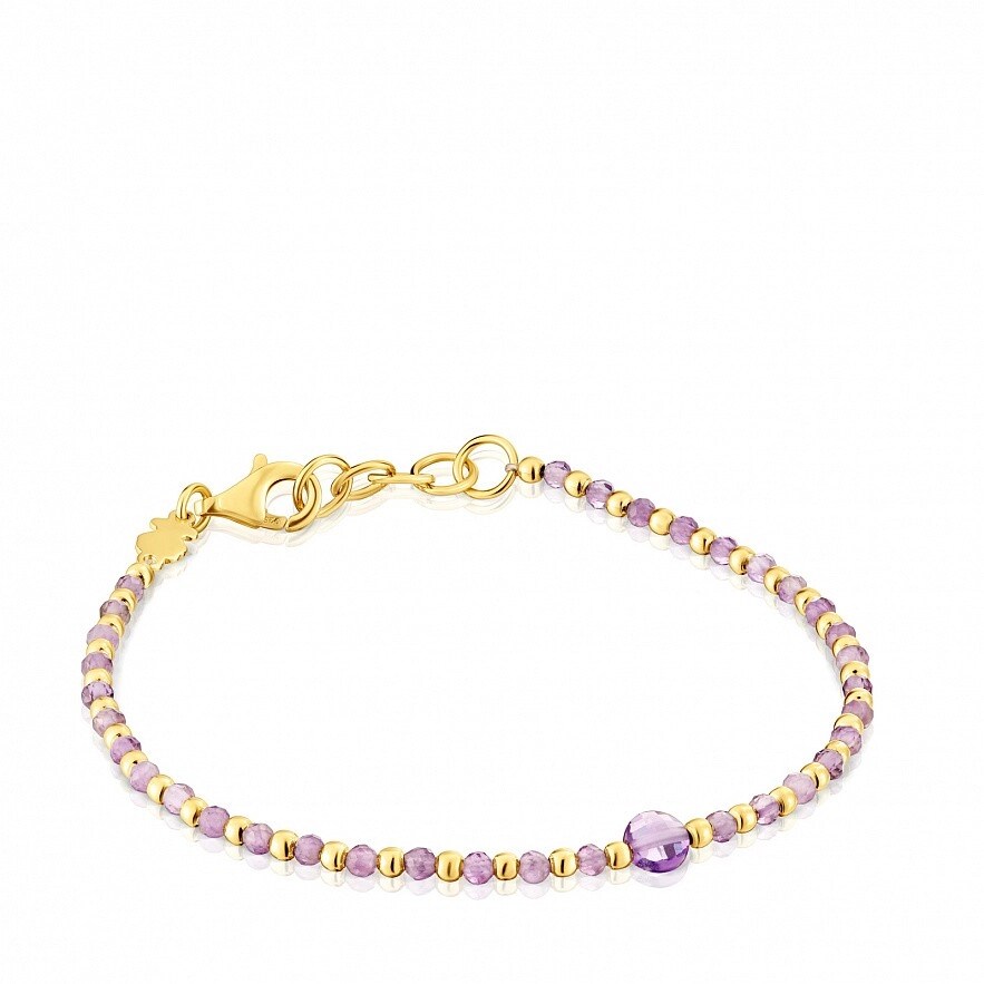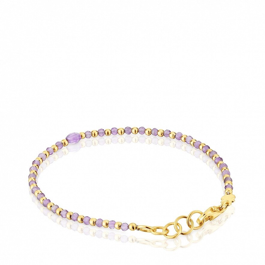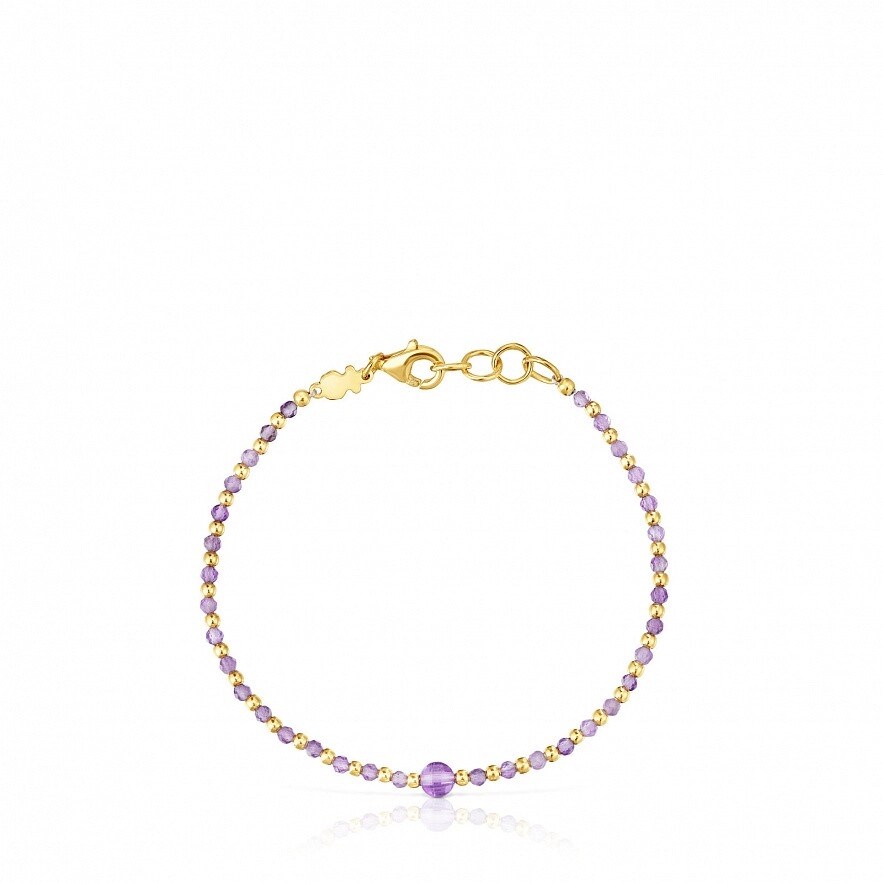 Браслет TOUS Basic Colors с покрытием из 18-каратного золота поверх серебра и граненым аметистом. Размер камня: ограненные шарики 2 мм, центральная часть 4,5 мм. Длина браслета: 17,5 см. Застежка-лобстер. Изделие изготовлено из стерлингового серебра с золотым покрытием от 18 до 23 карат и толщиной 3 микрона. Это качество гарантирует большую долговечность украшения.