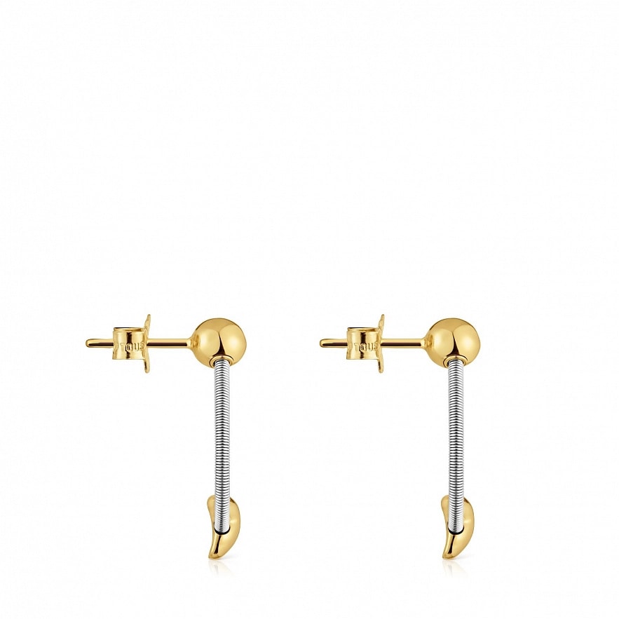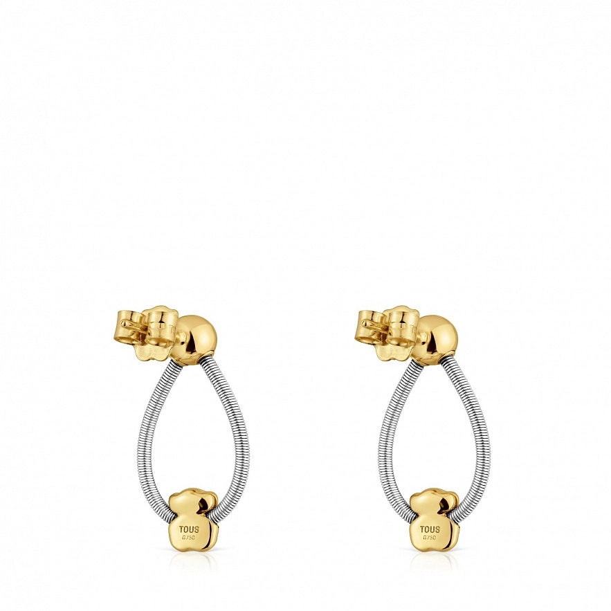 Серьги TOUS Mesh Tube из желтого золота 18 карат со стальным сетчатым кругом, соединенным золотым шариком на застежке, и мотивом мишки на нижней части.