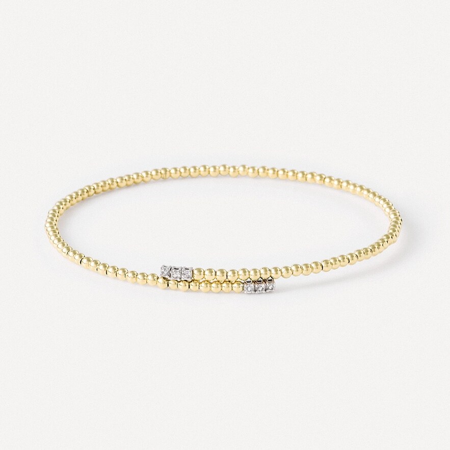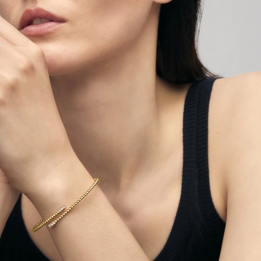 Браслет TOUS Atelier из 18-каратного желтого золота с титановым сердечником, оправой из белого золота и бриллиантами круглой огранки. Титановый сердечник делает изделие очень гибким и эргономичным. Общий вес бриллиантов: 0,08 карата. Качество бриллиантов: H/SI.