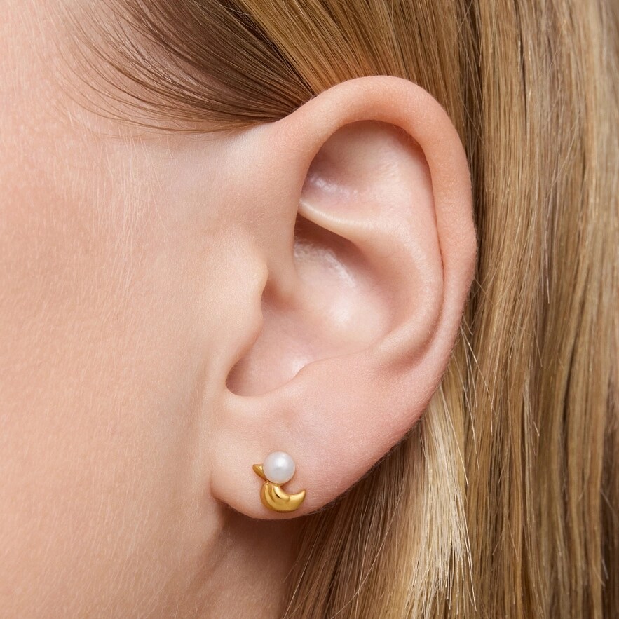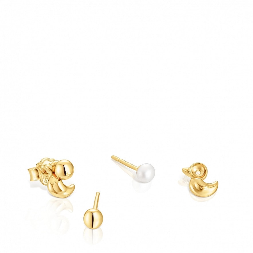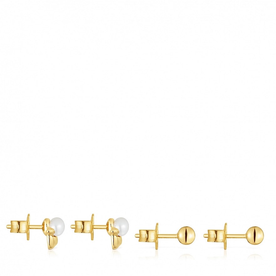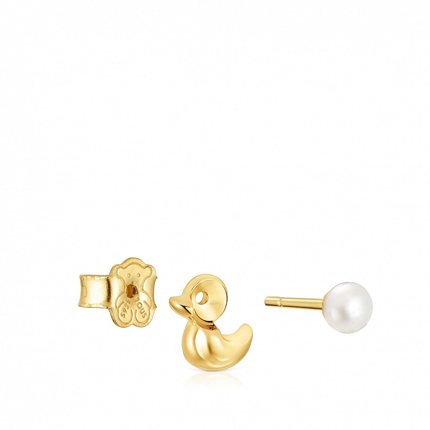 Набор сережек TOUS Virtual Garden из серебра 925 пробы с покрытием Vermeil и культивированным жемчугом. Основа серьги в форме уточки без застежки; взаимозаменяемые между двумя разновидностями сережек. Одна серьга в форме шарика с 18-каратным золотым покрытием, а другая с культивированным пресноводным жемчугом. Размер культивированного жемчуга: 3.2 мм. Размер шарма: 3,2 мм. Застежка-пусет.
