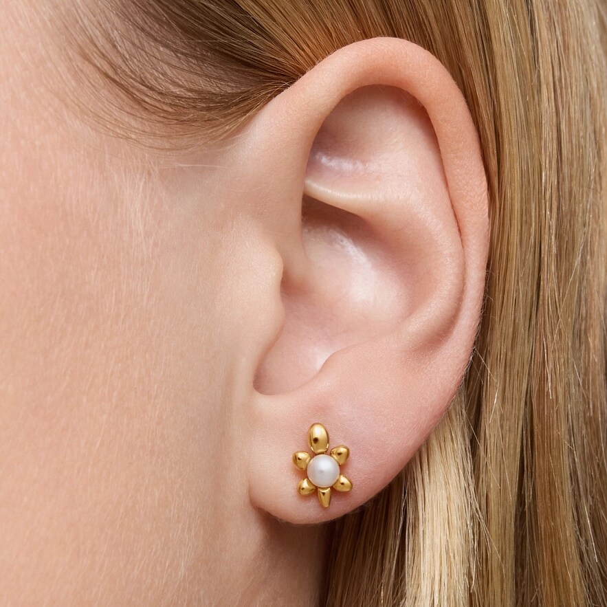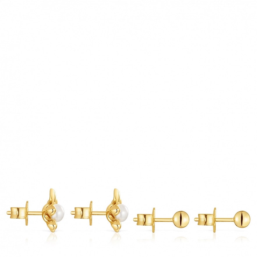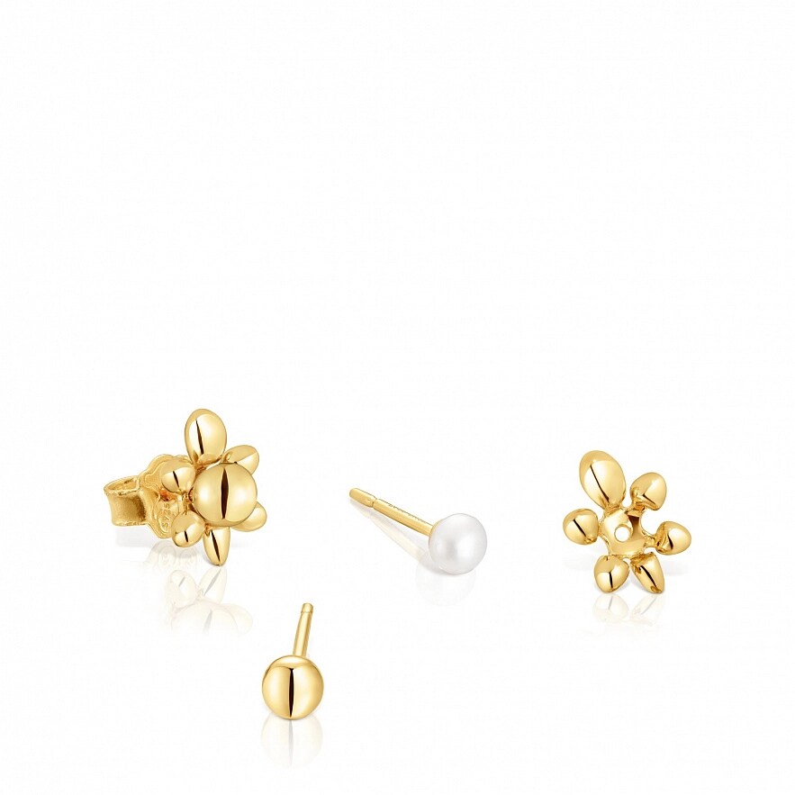Набор сережек TOUS Virtual Garden из серебра 925 пробы с покрытием Vermeil и культивированным жемчугом. Основа серьги в форме черепахи без застежки; взаимозаменяемая между двумя разновидностями сережек. Одна серьга в форме шарика с 18-каратным золотым покрытием, а другая с культивированным пресноводным жемчугом. Размер культивированного жемчуга: 3.2 мм. Размер шарма: 3,2 мм.