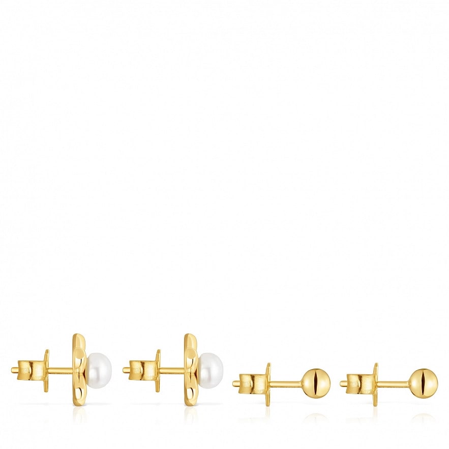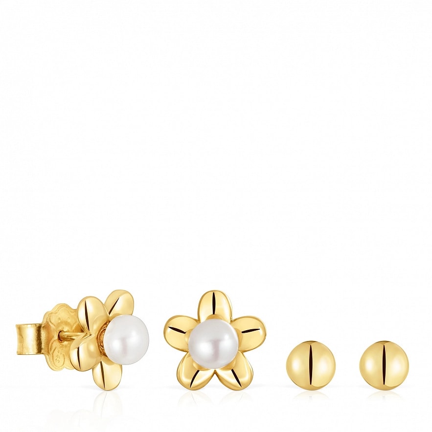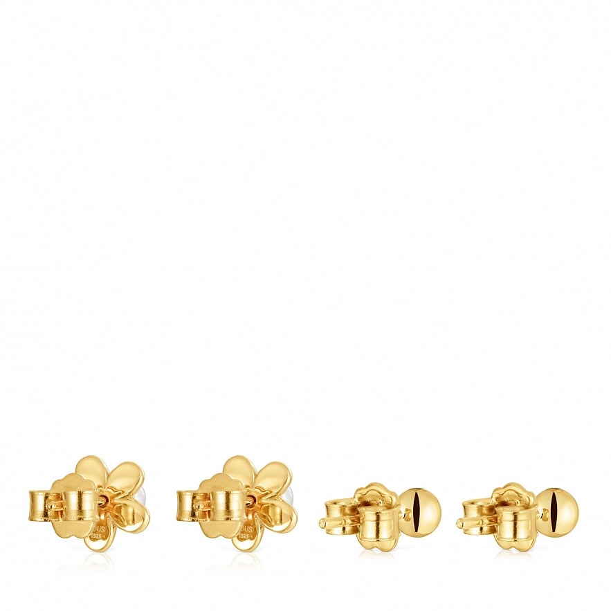 Набор сережек TOUS Virtual Garden из серебра 925 пробы с покрытием Vermeil и культивированным жемчугом. Основа серьги в форме цветка без застежки; взаимозаменяемые между двумя разновидностями сережек. Одна серьга в форме шарика с 18-каратным золотым покрытием, и другая пара с культивированным пресноводным жемчугом. Размер культивированного жемчуга: 3.2 мм. Размер шарма: 3,2 мм.