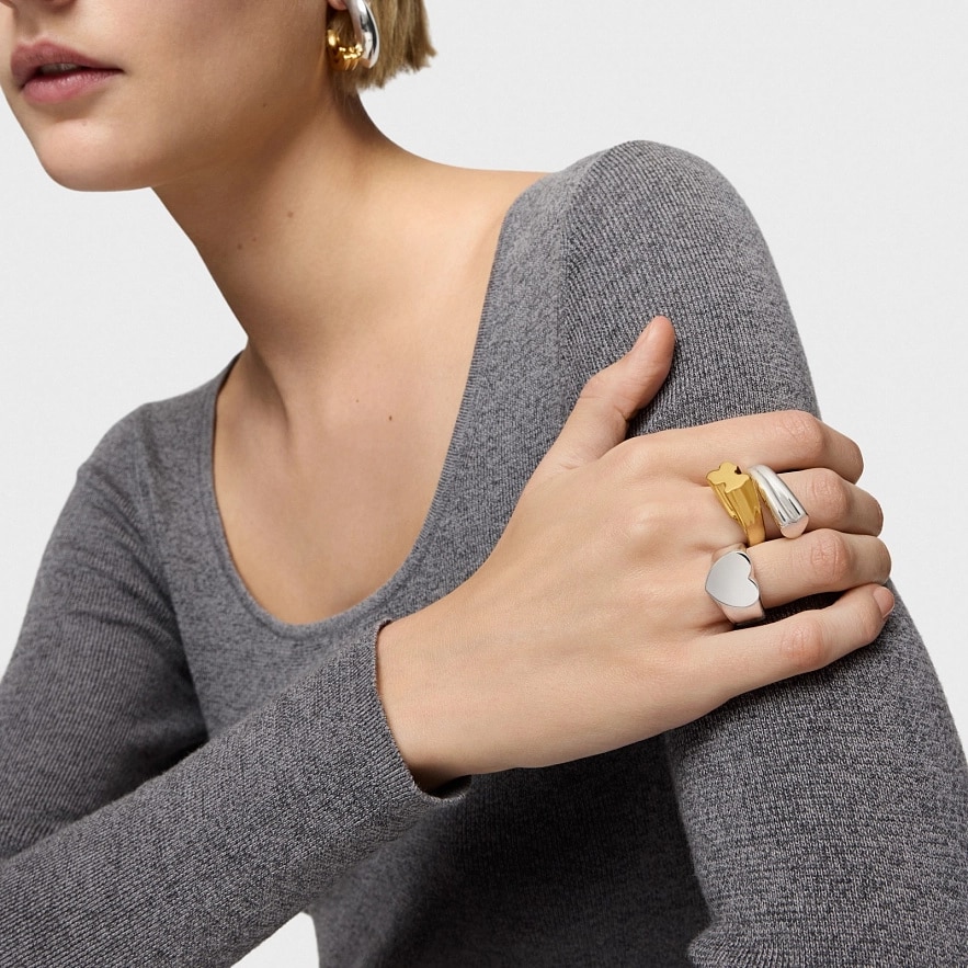 Кольцо TOUS 1950 из серебра 925 пробы с покрытием Vermeil с серебряными вставками в виде мишки и сердца. Ширина мотива мишки - 9,35 мм, мотива сердца - 9,60 мм.