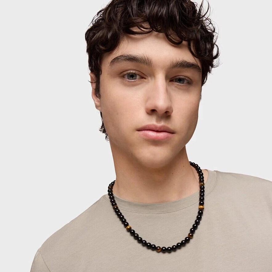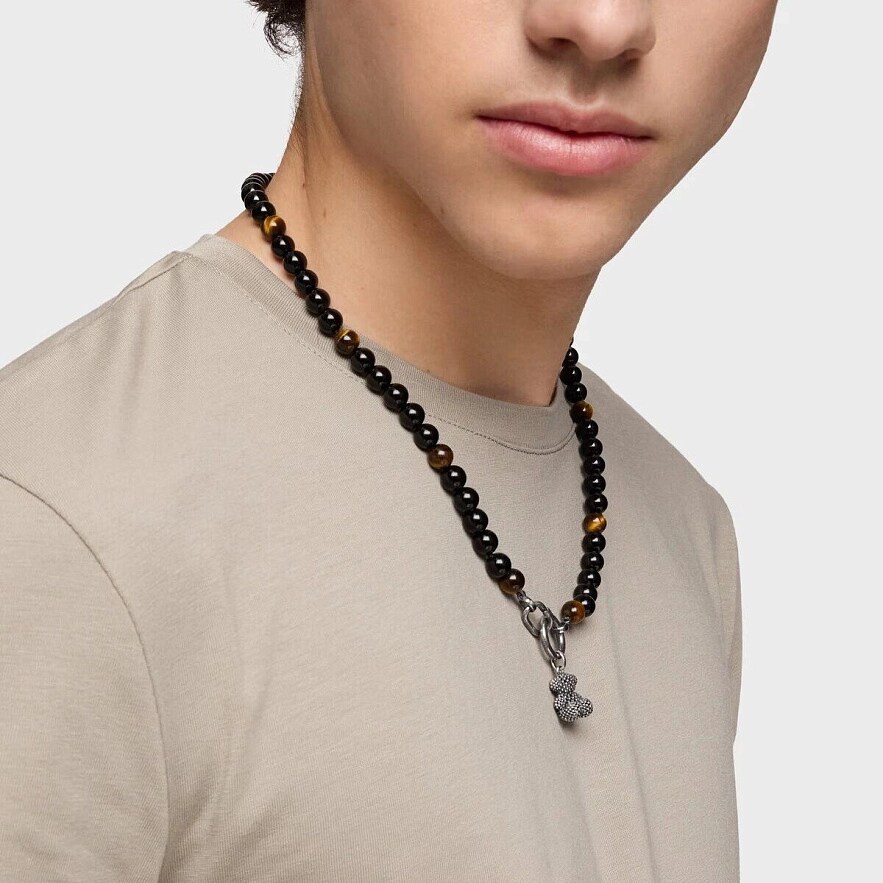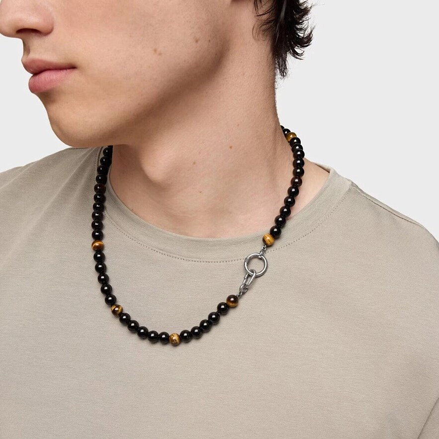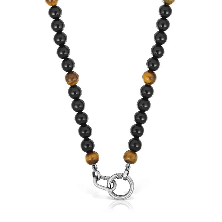 Колье TOUS Hold Man из серебра 925 пробы с двумя кольцами-фиксаторами и гладкими бусинами из оникса и тигрового глаза. Размеры колец: 10х5 мм и 16 мм. Длина колье: 54, 5 см. Замковые кольца фиксируют. Примечание: персонализируйте с помощью кулонов, брелоков или колец.