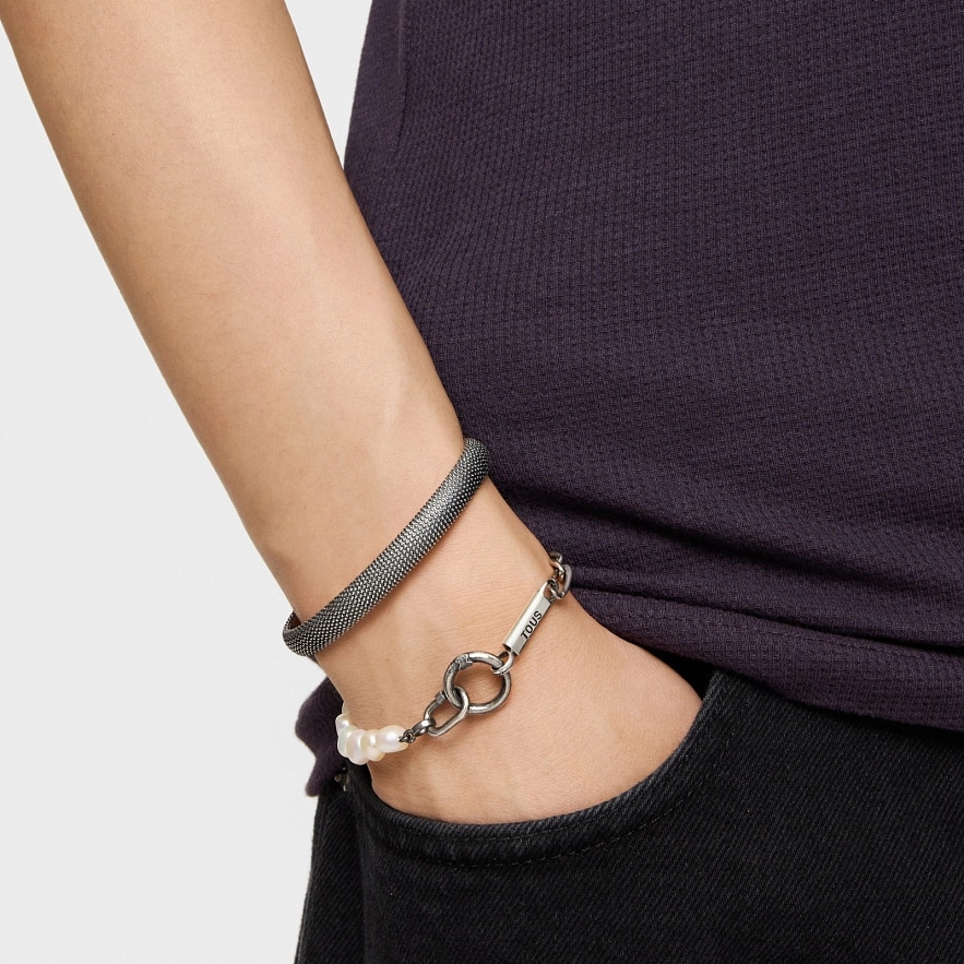 Браслет TOUS Hold Man с серебряной цепочкой и культивированными пресноводными жемчужинами. Размеры колец: 10x5 мм и 16 мм. Общая длина: 20,5 см. Застежка TOUS Hold.