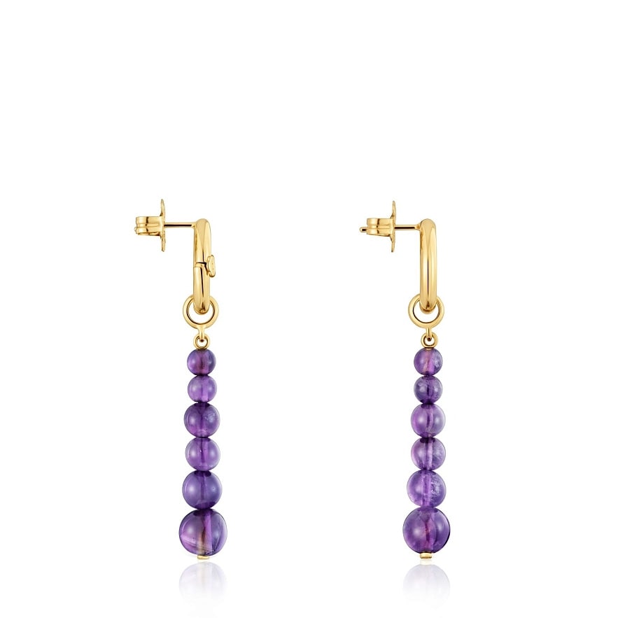 Длинные серьги TOUS Hold из серебра с покрытием из 18-каратного золота и круглым граненым аметистом. Длина сережек: 60 мм. Длина кольца Hold: 16 мм. Застежка-пусет. Изделие изготовлено из серебра 925 пробы с покрытием из 18-23-каратного золота толщиной 3 микрона. Такое качество гарантирует большую долговечность украшения.