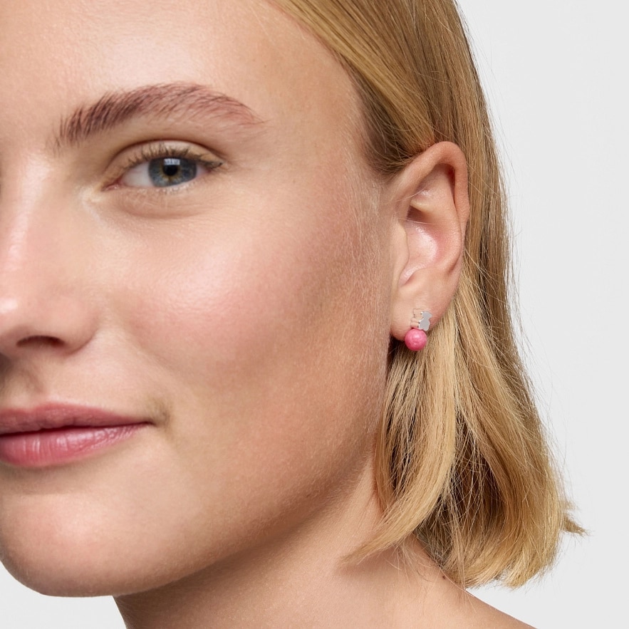 Серьги TOUS Icon Mesh из стали и серебра 925 пробы с мотивом медвежонка и шариком из родонита. Размер серег: 6 мм. Застежка-пусет.