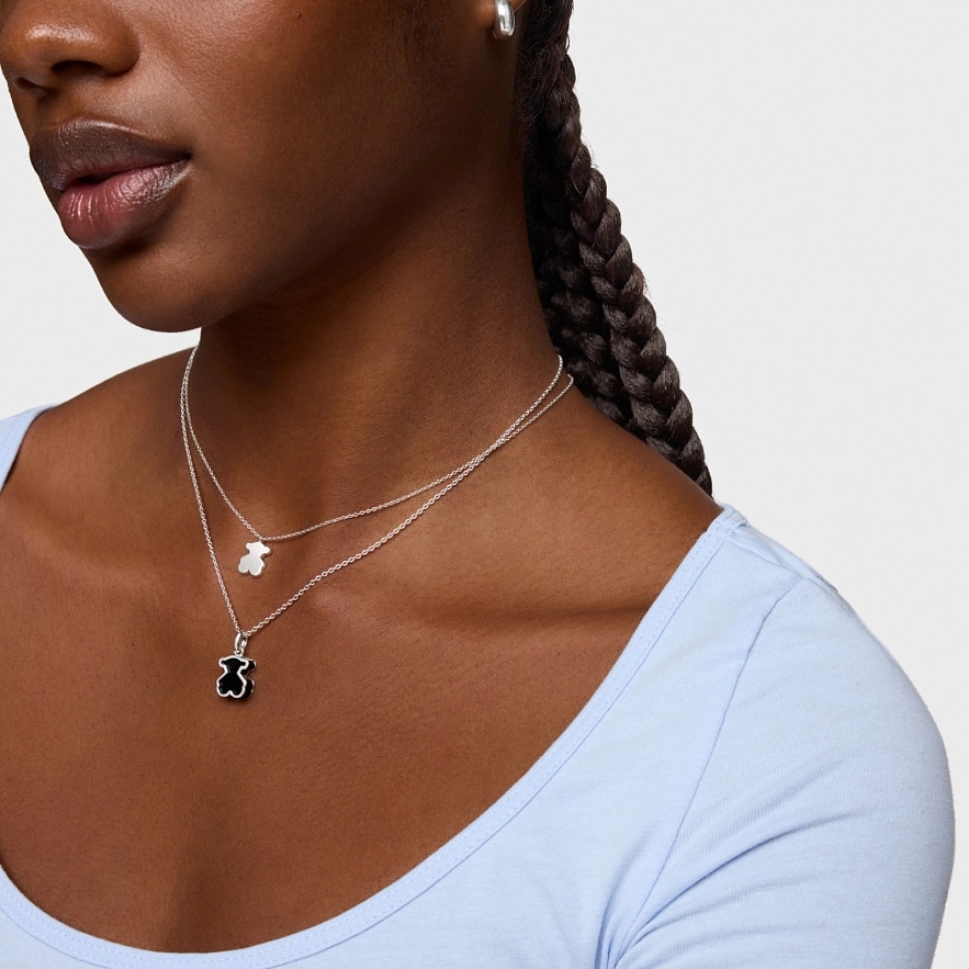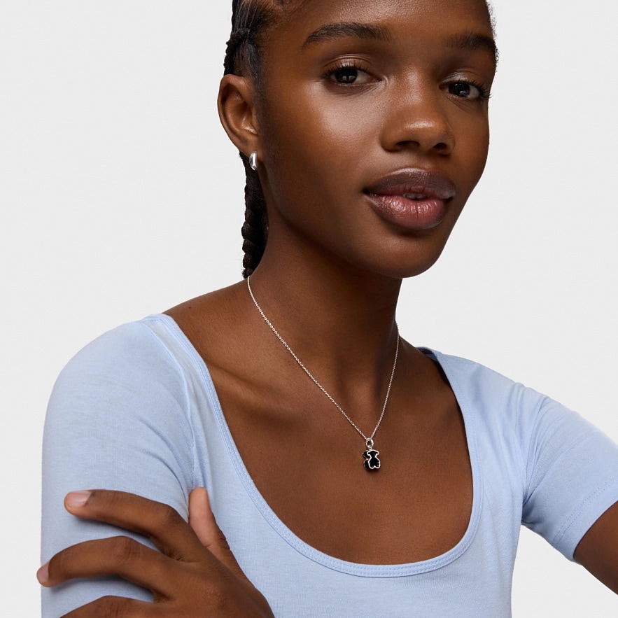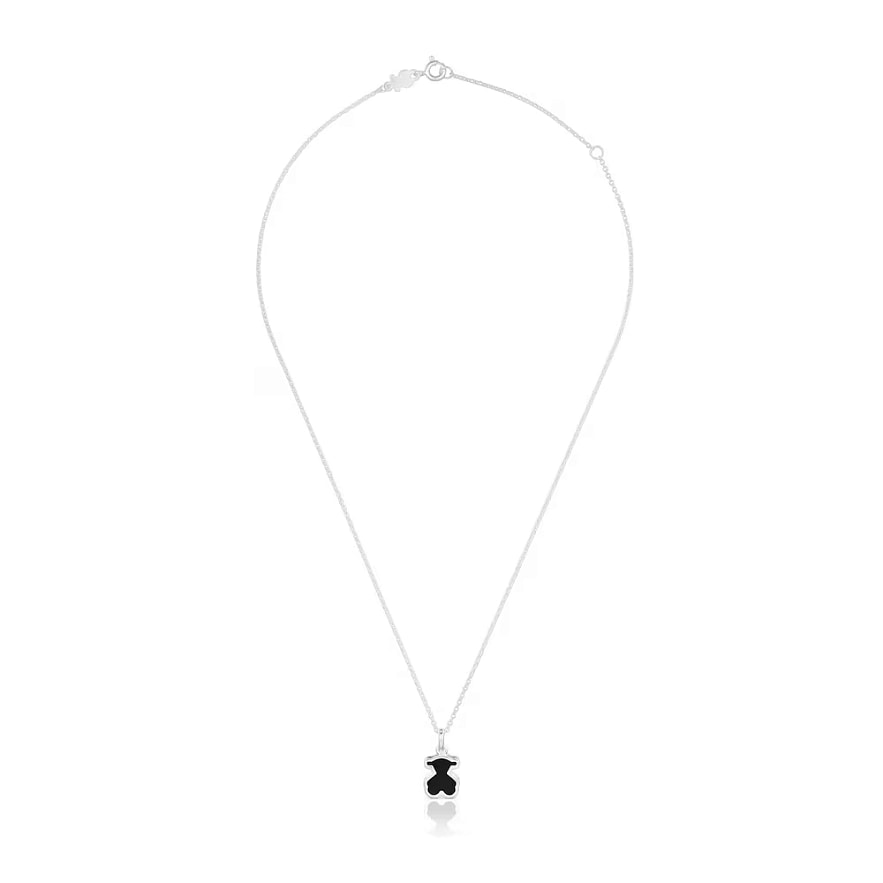 Колье TOUS Galaxy из серебра 925 пробы в форме мишки и черного акрилового стекла-метакрилат. Размер подвески: 12 мм. Длина колье: 45 см. Застежка-лобстер.