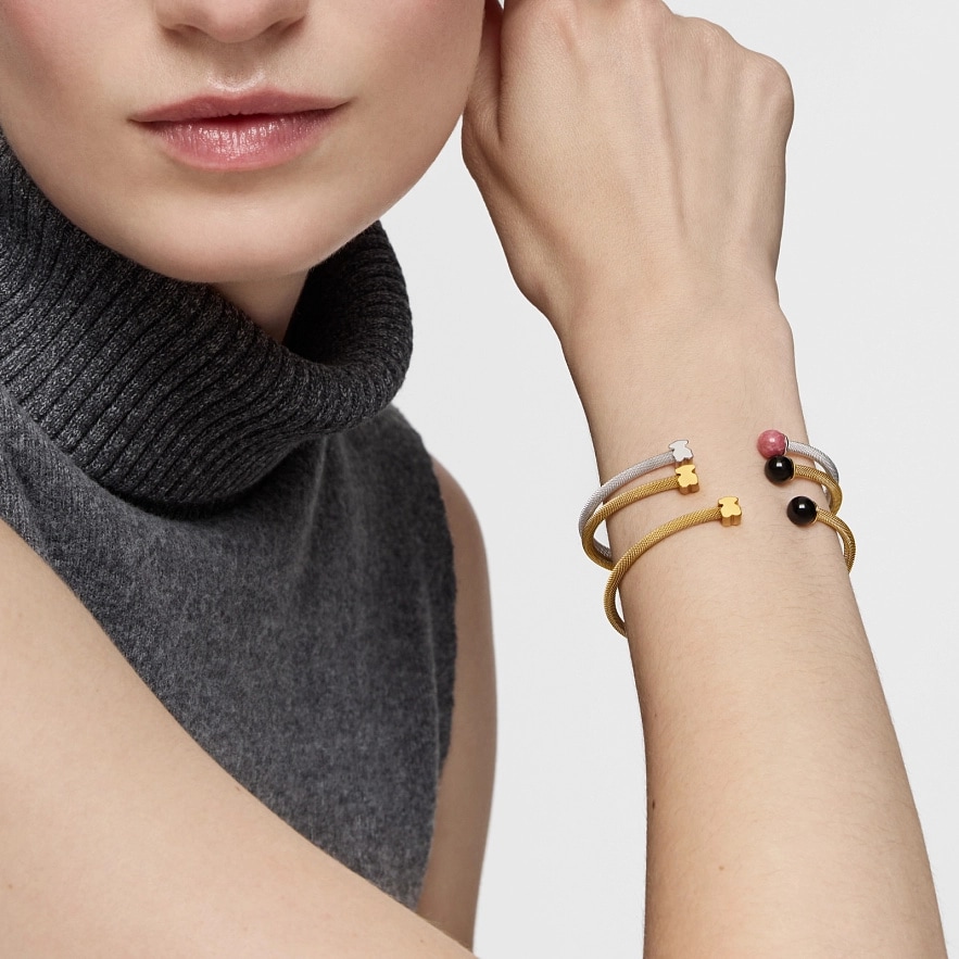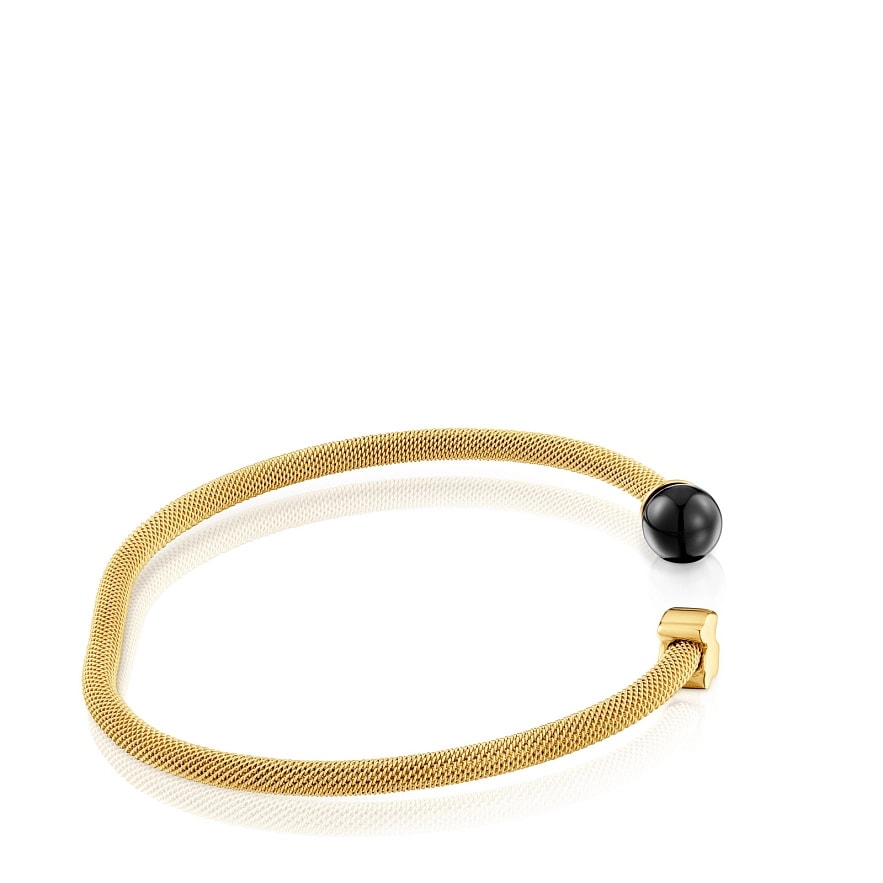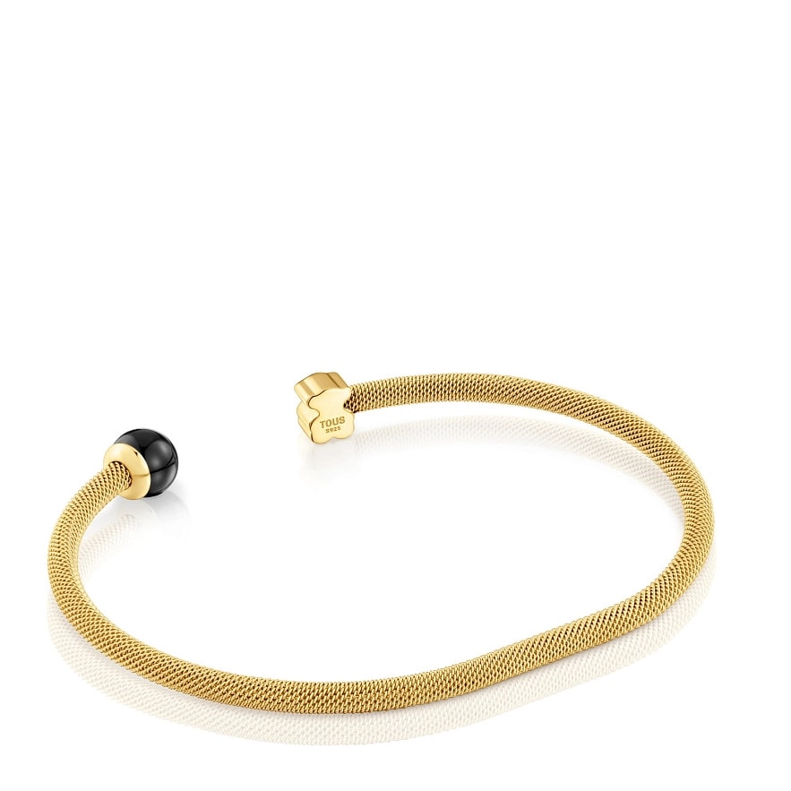 Браслет TOUS Icon Mesh из стали и серебра 925 пробы с покрытием Vermeil с мотивом мишки и шариком из оникса. Размер мотива: 6 мм. Толщина браслета: 2,75 мм.