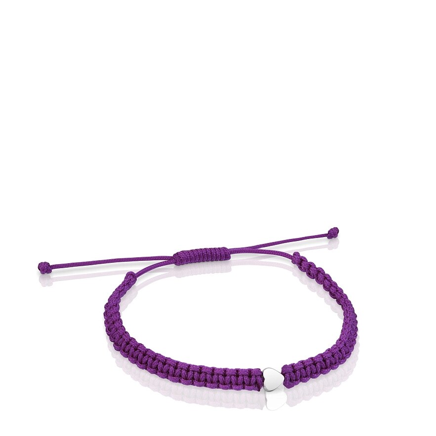 Браслет TOUS Motifs из серебра 925 пробы с мотивом сердца и лиловым нейлоном. Длина браслета: 17 см. Застежка-слайдер.