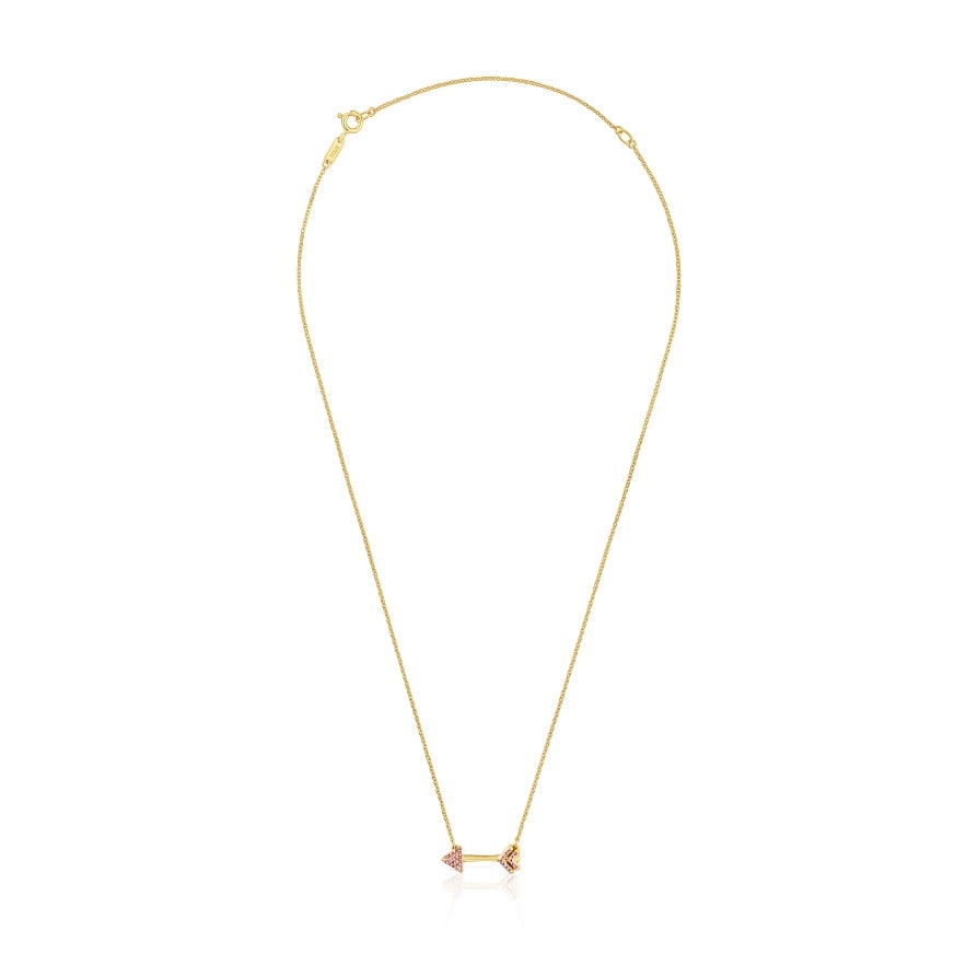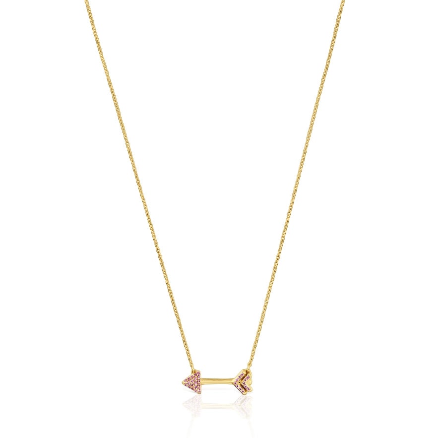 Колье TOUS Flechazo из серебра 925 пробы с 18-каратным золотым покрытием с мотивом стрелы и ограненными круглыми родолитами. Длина колье: 45 см. Застежка-пружина. Изделие изготовлено из серебра 925 пробы с 18-23-каратным золотым покрытием толщиной 3 микрона. Такое качество гарантирует большую долговечность украшения.