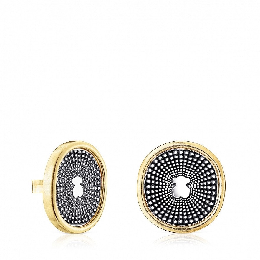 Серьги TOUS Oursin с серебряным безелем с покрытием Vermeil , мишкой из стерлингового серебра и черной эмалью. Размер сережек: 19 мм. Застежка – пусет. Серебро 925 пробы. Vermeil : серебро с золотым покрытием 18 карат.