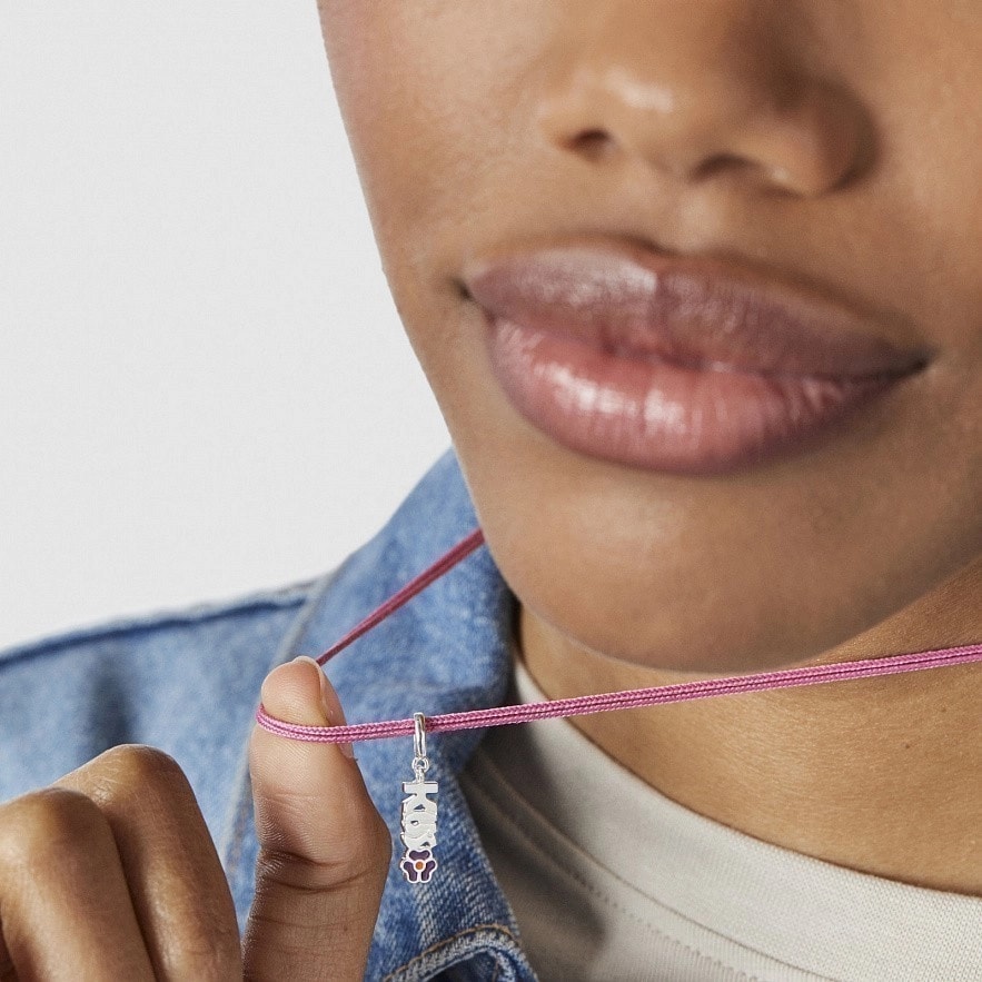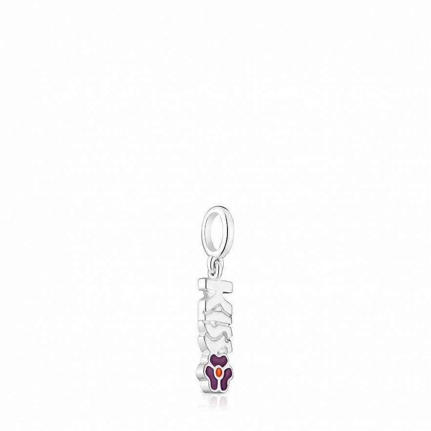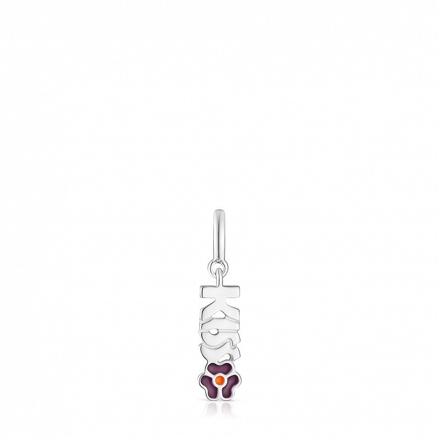 Кулон TOUS Crossword из серебра 925 пробы со словом KISS с фиолетовым цветком. Размер 14 мм.