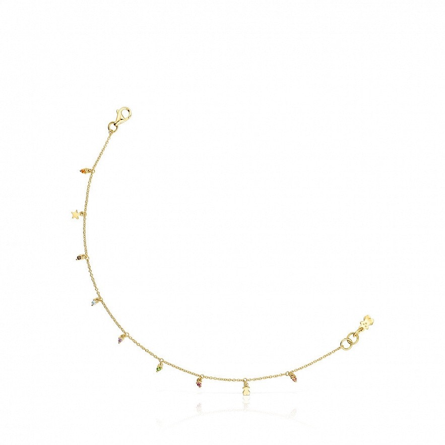 Браслет Virtual Garden из золота 750 пробы с висячими деталями из драгоценных камней вокруг цепочки: оранжевый сапфир, родолит, диопсид хрома, аметист, синий топаз, дымчатый кварц и цитрин. Между драгоценными камнями шармы с медведями и звездами. Размер драгоценных камней: 1,5 мм. Размер шармов: 2-3 мм. Застежка-лобстер. Длина браслета: 17,5 см.