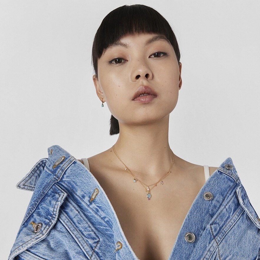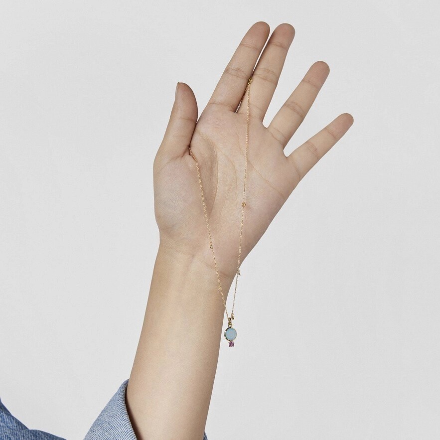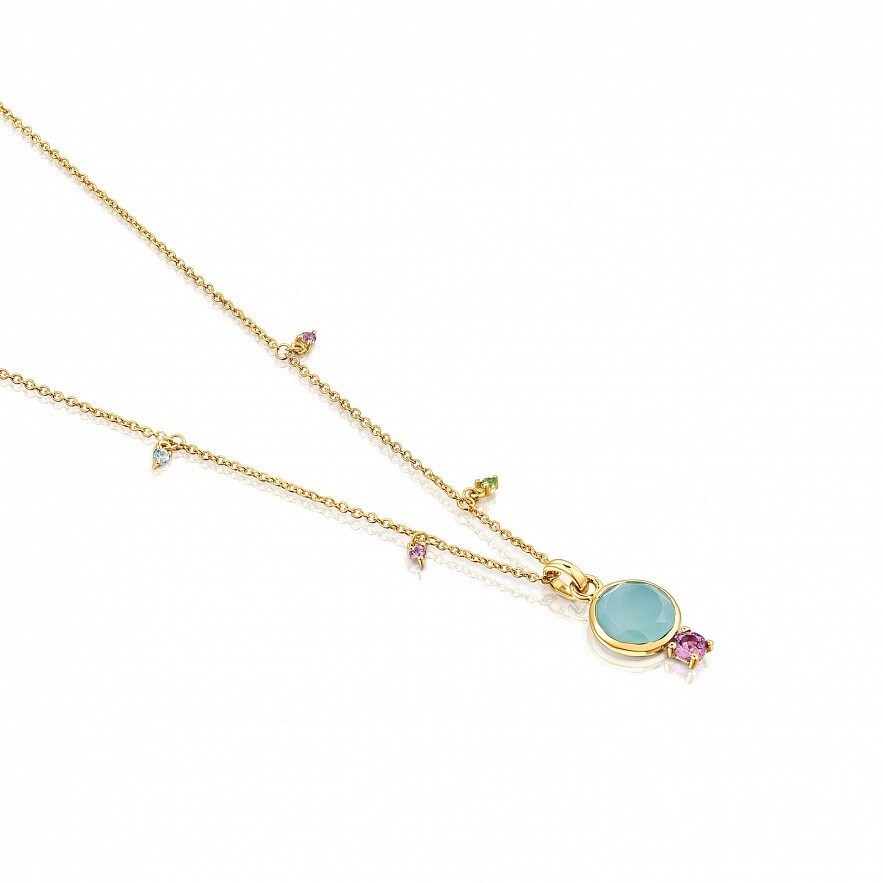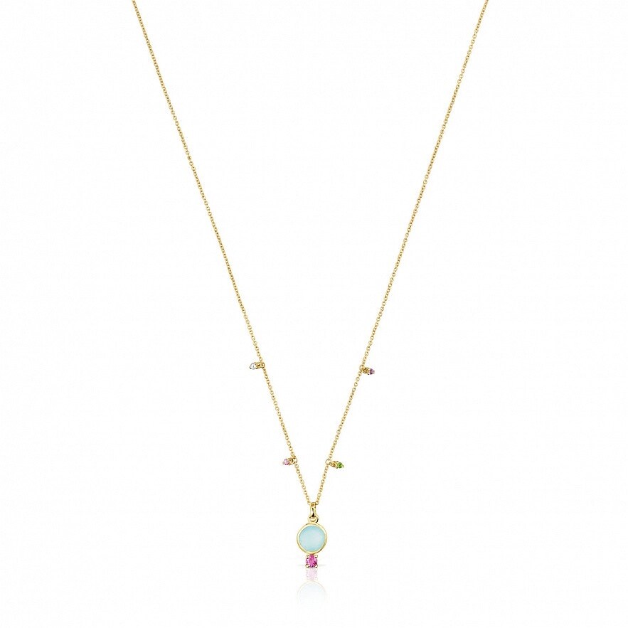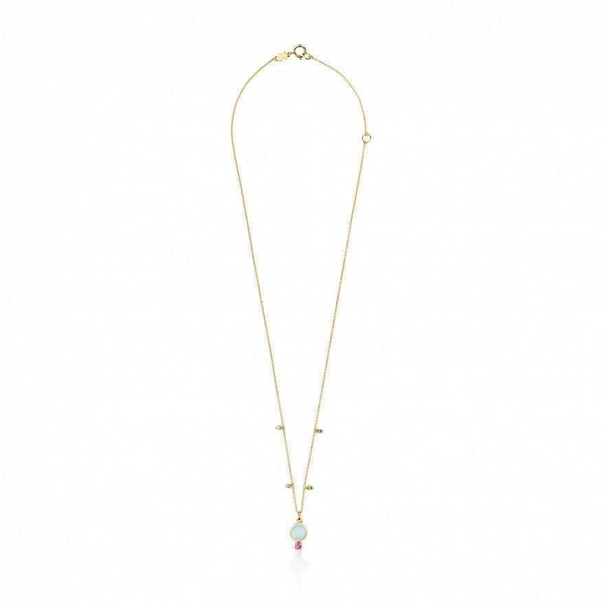 Колье TOUS Virtual Garden из золота 750 пробы с халцедоном 7 мм и родолитом 3 мм. Детали драгоценных камней вокруг цепочки: синий топаз, родолит, диопсид хрома и аметист. Размер деталей из драгоценных камней: 1,5 мм. Застежка - пружинное кольцо. Длина колье: 45 см.
