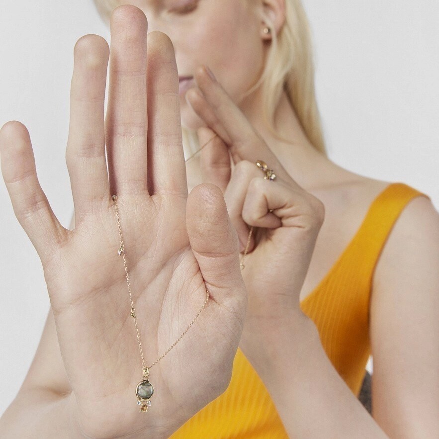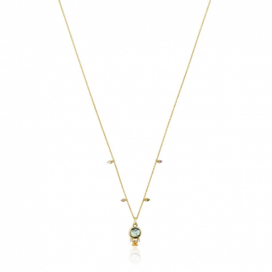 Колье TOUS Virtual Garden из золота 750 пробы с лабрадоритом 7 мм, оранжевым сапфиром 3 мм и двумя голубыми топазами 1,5 мм. Детали из драгоценных камней вокруг цепочки: синий топаз, аметист, родолит и диопсид хрома. Размер деталей из драгоценных камней: 1,5 мм. Застежка - пружинное кольцо. Длина колье: 45 см.