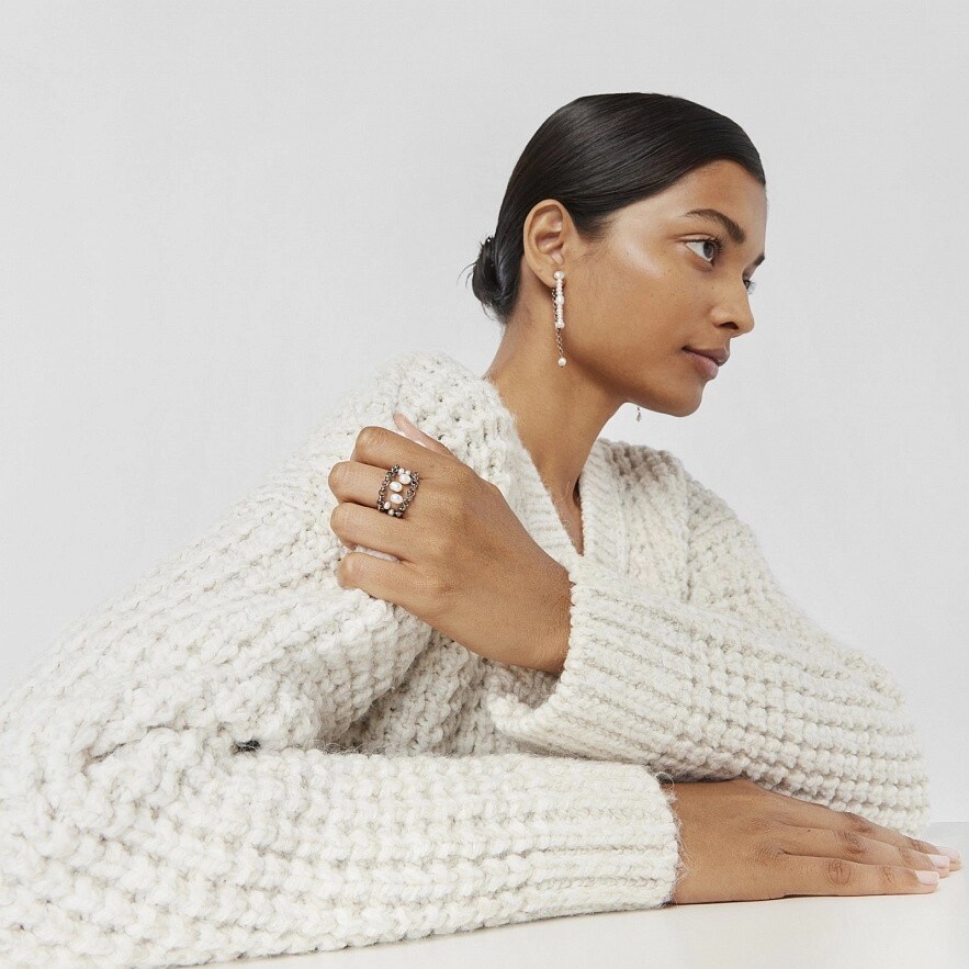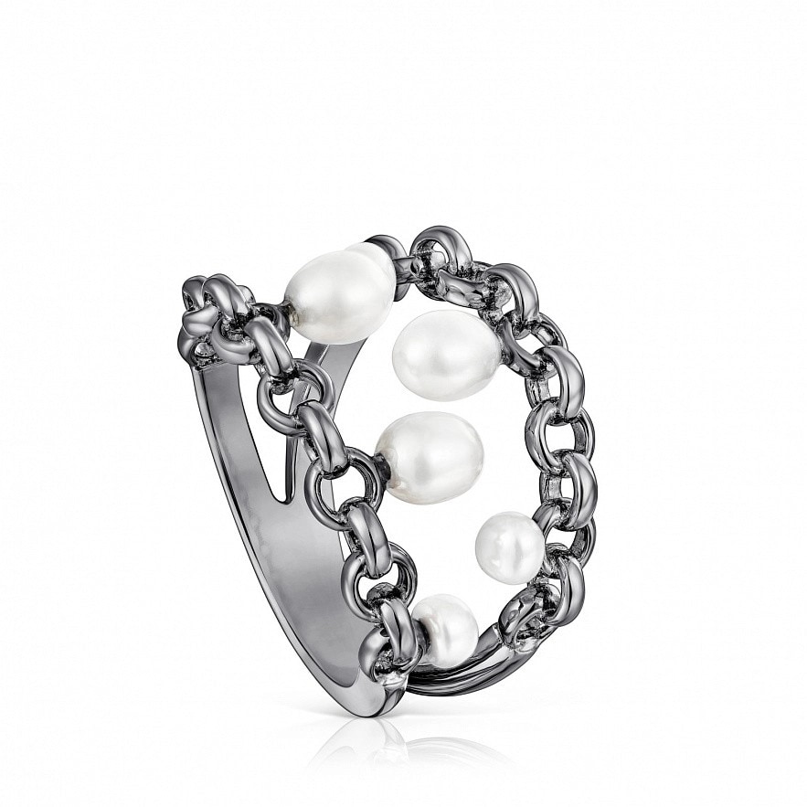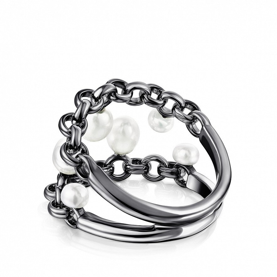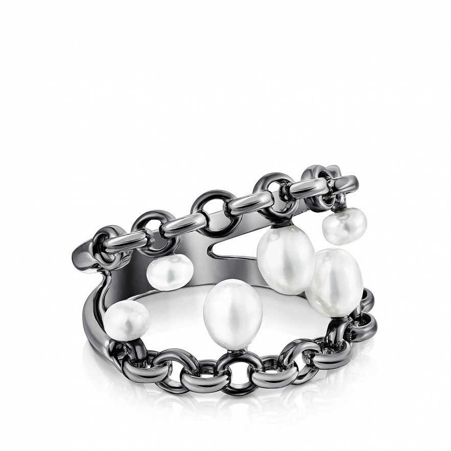 Кольцо TOUS Virtual Garden из темного серебра 925 пробы с культивированным жемчугом разного размера. В центре, между двумя небольшими цепочками кольца, мотив из культивированного жемчуга размером 6 х 4 мм, по бокам - культивированный жемчуг размером 3,5 мм. Толщина верхней части: 9 мм.