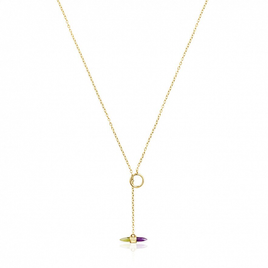 Золотое колье 750 пробы TOUS Lure с аметистом и перидотом и с деталью мишки 2,8 мм в центре мотива, связывающего драгоценные камни, которые служат передней застежкой. Размер драгоценных камней: 7,5 х 2,6 мм. Размер мотива: 15 мм. Длина колье: 40 см.